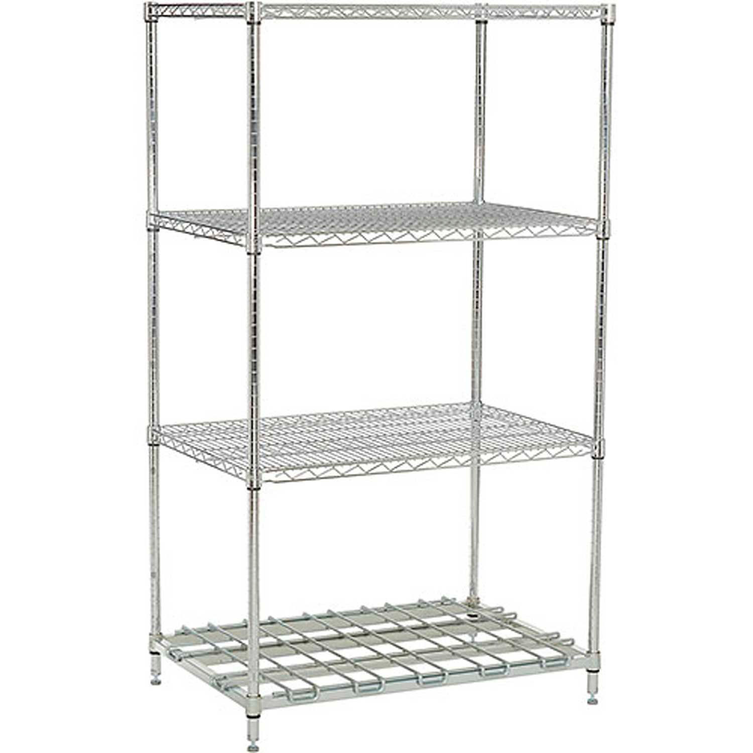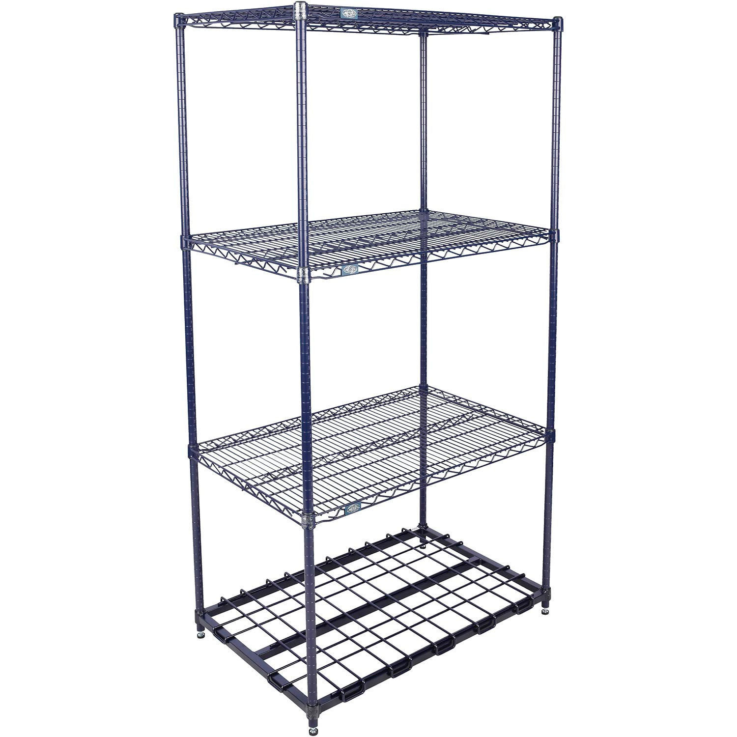 Nexelon® Starter Units with Dunnage Bottom Shelf feature a top of the line blue metallic finish designed to handle extreme wet, hot or cold environments. Starter Unit includes 4 posts with leveling feet, 3 wire shelves, 1 bottom dunnage shelf and plastic snap on sleeves to secure shelves to posts. , Lot of 1