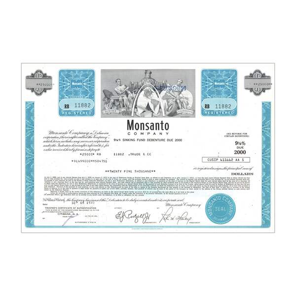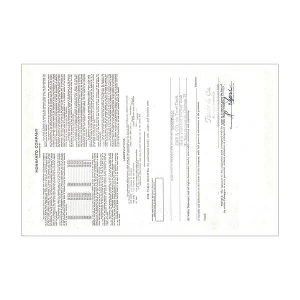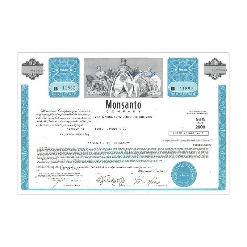 A stock certificate is a physical piece of paper representing ownership in a company. Stock certificates include information such as the shareholder name, number of shares owned, date issued, an identification number, and usually a corporate seal and signatures. Unlike a stock, a bond is a fixed income instrument that represents a loan made by an investor to a borrower, typically a government or corporation, to finance projects and operations. A bond certificate includes the loan terms, bond holder, principal due date, schedule of interest payments, and usually a corporate seal and signatures. Many vintage bond certificates also include attached interest payment coupons, which needed to be physically cut off the bond and redeemed for each interest payment.