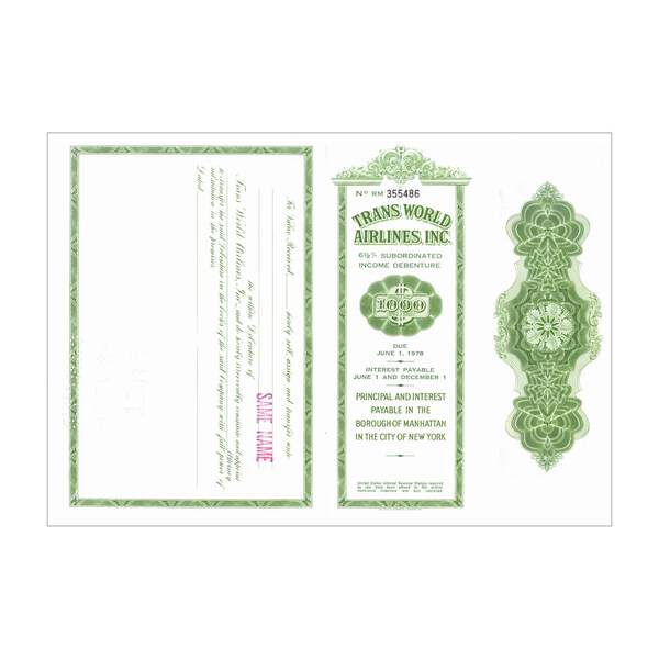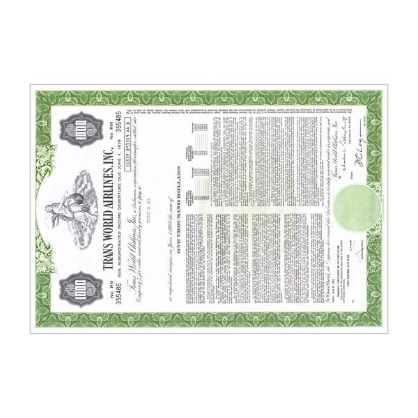 Trans World Airlines Inc. Stock Certificate // 1,000 Shares // Green // 1970s