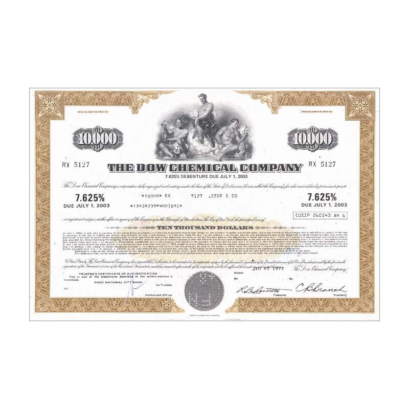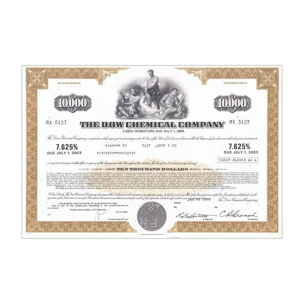 A stock certificate is a physical piece of paper representing ownership in a company. Stock certificates include information such as the shareholder name, number of shares owned, date issued, an identification number, and usually a corporate seal and signatures. Unlike a stock, a bond is a fixed income instrument that represents a loan made by an investor to a borrower, typically a government or corporation, to finance projects and operations. A bond certificate includes the loan terms, bond holder, principal due date, schedule of interest payments, and usually a corporate seal and signatures. Many vintage bond certificates also include attached interest payment coupons, which needed to be physically cut off the bond and redeemed for each interest payment.