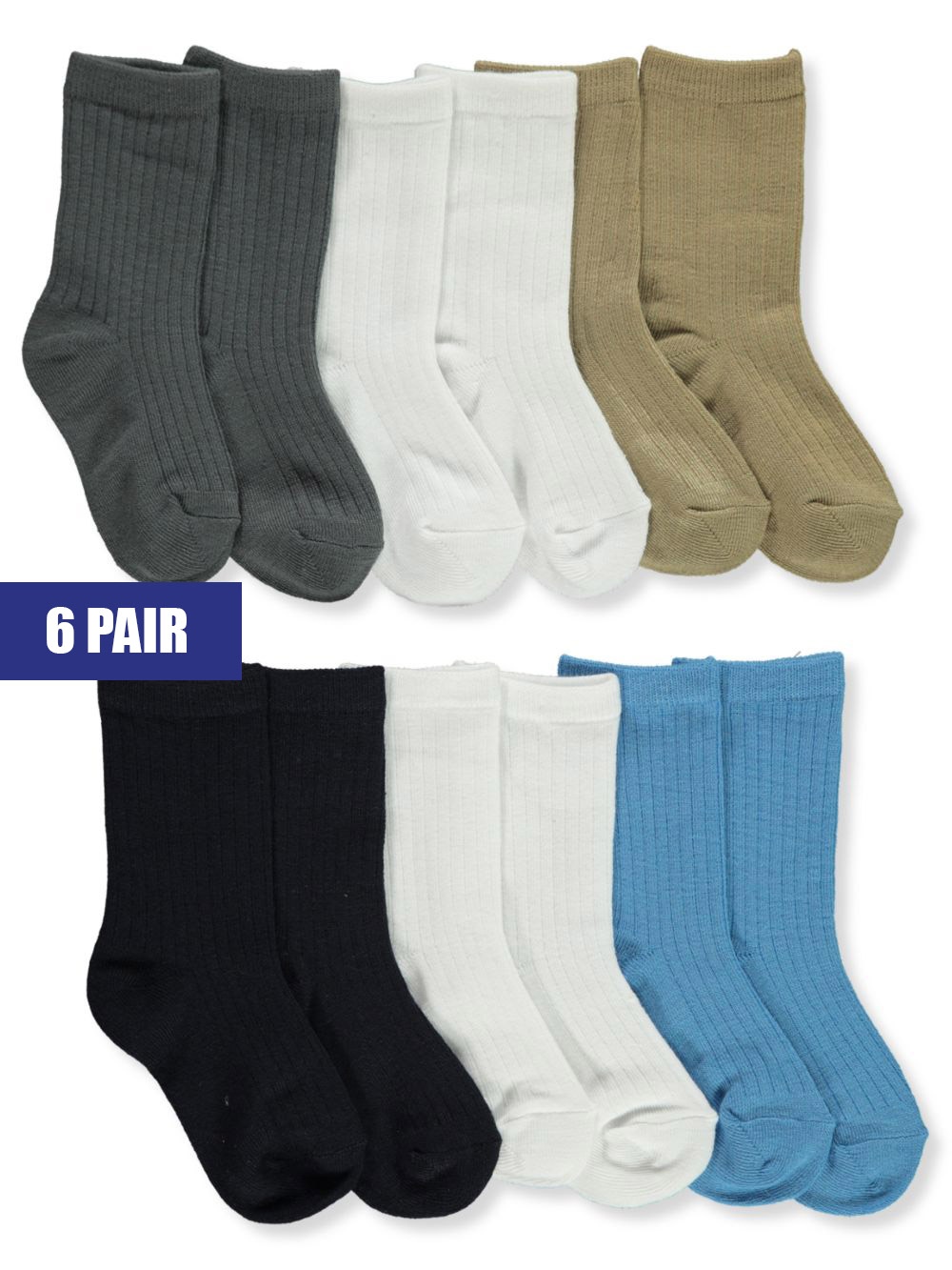 Stock up with this 6-pack by TSG! TSG ribbed socks Knit construction Ribbed style Stretch-knit fit 97% polyester, 3% spandex Machine wash cold Made in China