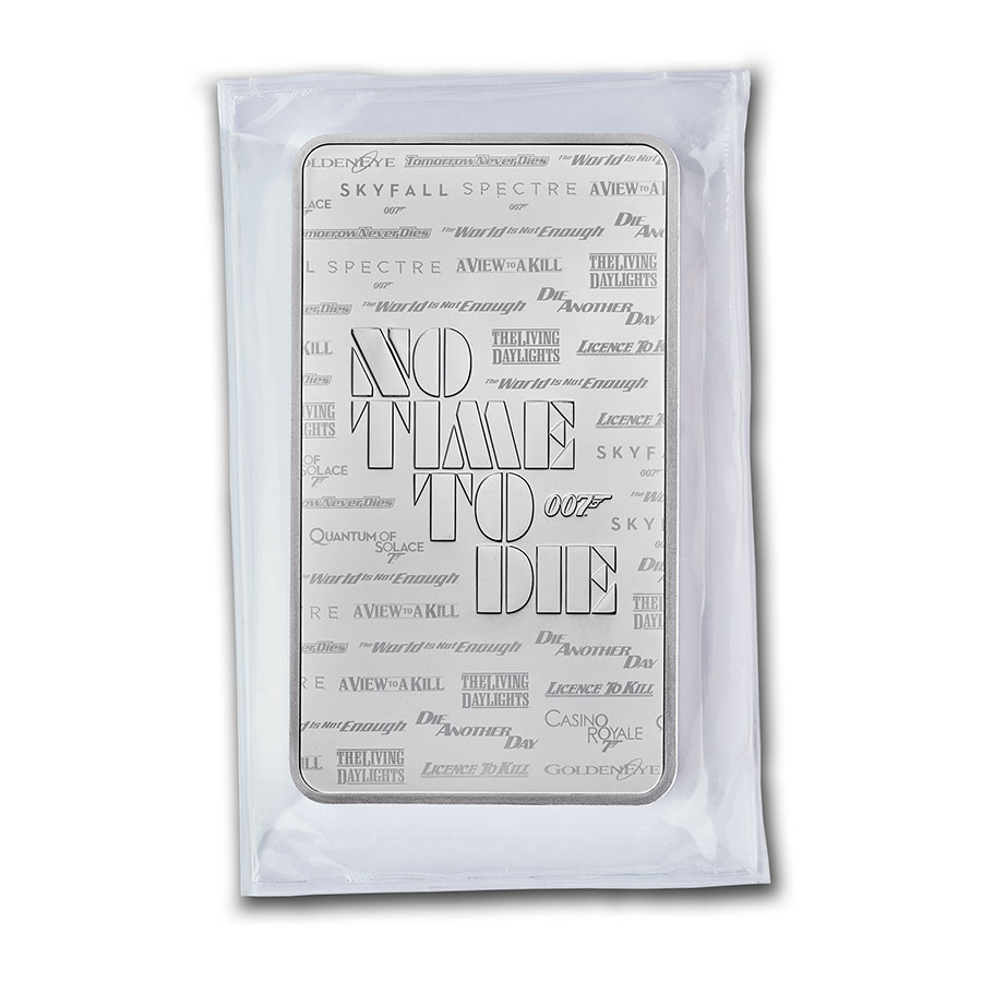 This bar marks the release of the James Bond Movie, No Time To Die, and features 10 oz of .9999 fine Silver.