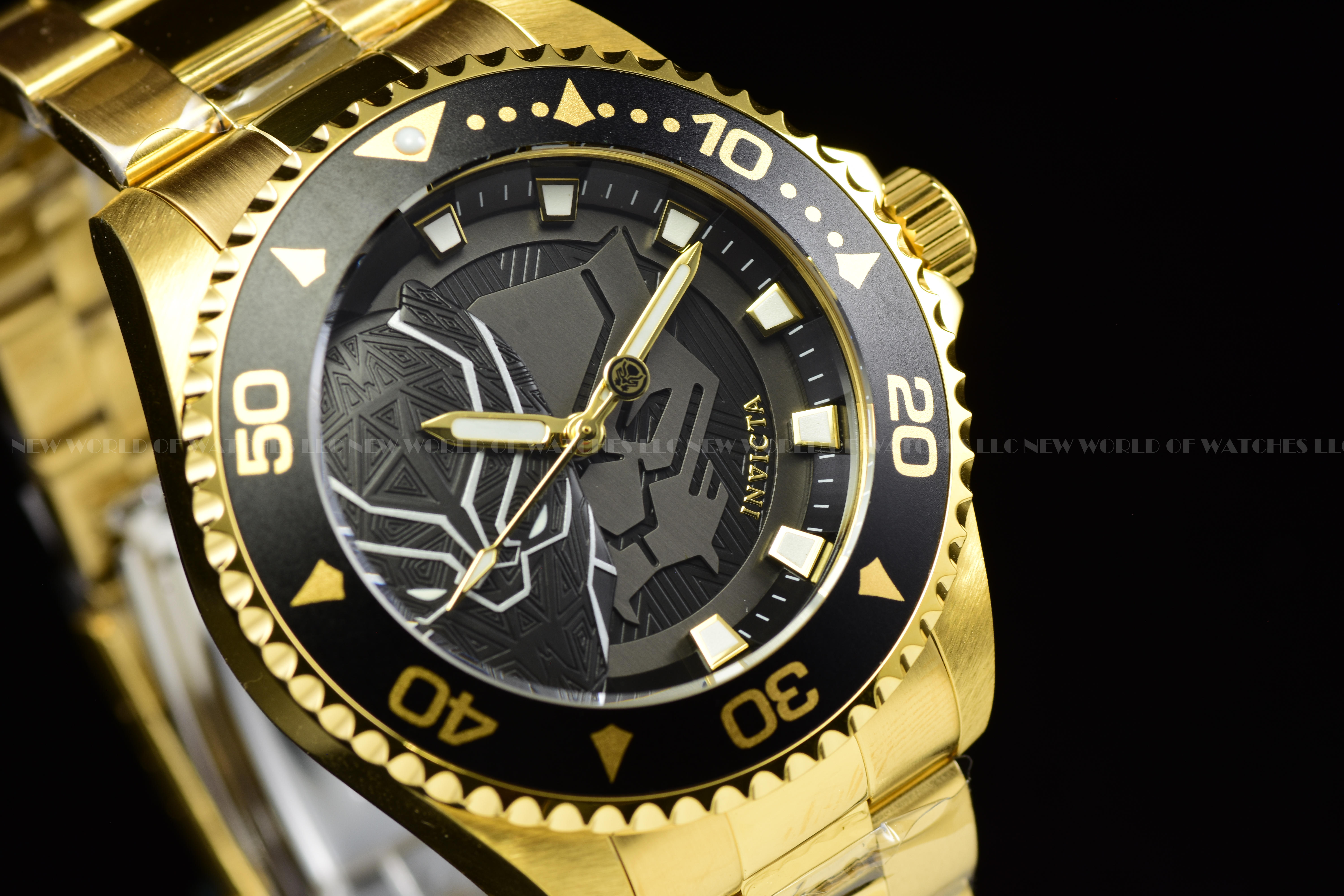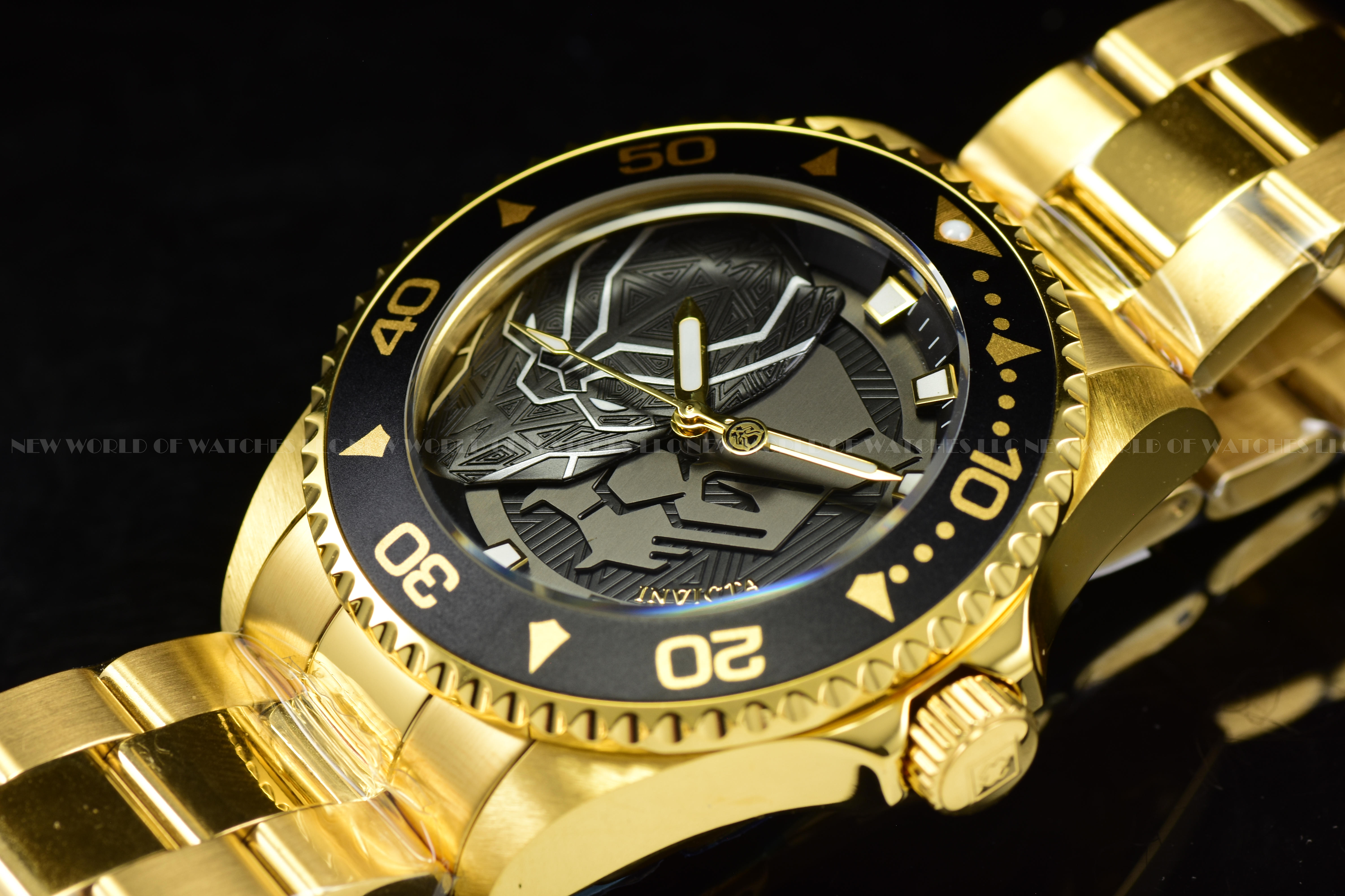 This beautiful Invicta Marvel watch contains a precise Quartz movement in addition to a gold case. Its face displays a black, metal dial protected by a highly resistant Mineral Crystal. This timepiece is completed by a gold, stainless steel band and it offers water resistance of up to 100 m.