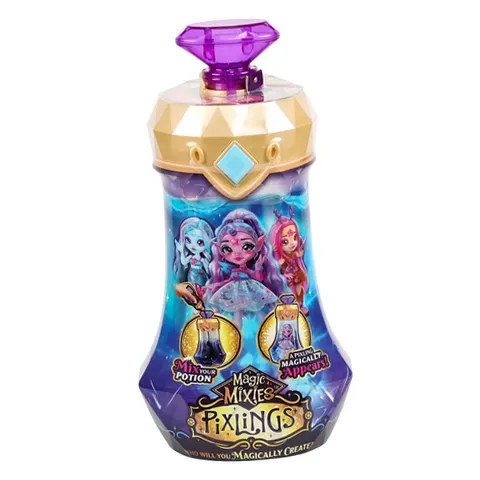 Your child will be spellbound as they enter the enchanted realm of the Magic Mixies Pixlings and create a magic potion that reveals the magical Pixling Marena! From a land where potions flow from waterfalls and fountains, this Pixling spreads magic moments and joy! Now girls can mix their own special potion to magically reveal this beautiful Pixling doll. To create their potion, combine water with the included magical ingredients in the Potion Bottle. The potion will swirl and mix to become a deep dark blue color within the bottle. Then they say the magic words, "Magicus Mixus", while turning and then pressing the Crystal Gem. Before their eyes the blue potion becomes clear, magically revealing Marena The Mermaid Pixling inside! This enchanting Pixling doll is easily removed from the bottle and is completely dry and ready for your child to play with! Marena has beautiful long hair and a mystical gem on her forehead. Marena is deep and thoughtful and has the sweetest heart.