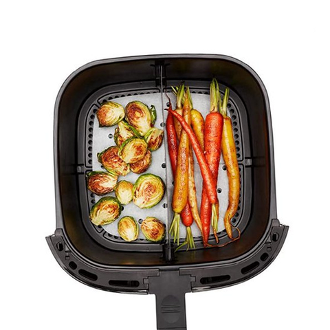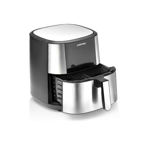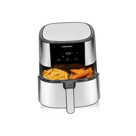 Air fry healthy, family-sized meals with the Chefman Turbo Fry Touch Air Fryer. Air fry with little to no oil for meals as nutritious as they are delicious. With an 8 quart capacity and a convenient built-in divider, you can whip up whatever your crowd is craving. The divider allows you to air fry two different foods at once, whether that be veggies, fries, chicken, or pizza.