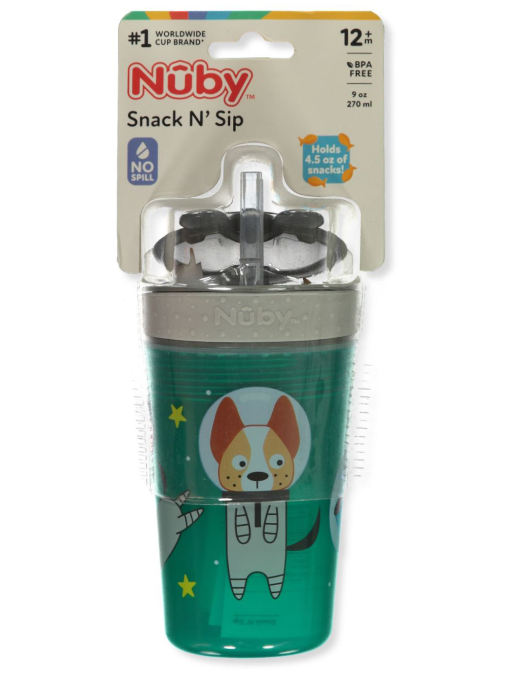 Perfect for snacks and drinks on-the-go, this cup from Nuby is great for picnics, hikes, and other activities! Nuby Snack N Sip Cup BPA-free construction Ages 12m+ 9 oz. capacity No-spill design Holds 4.5 oz of snacks Made in China