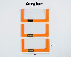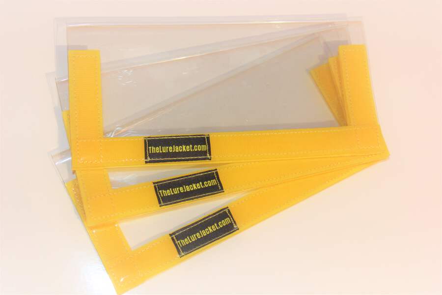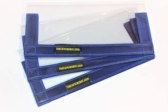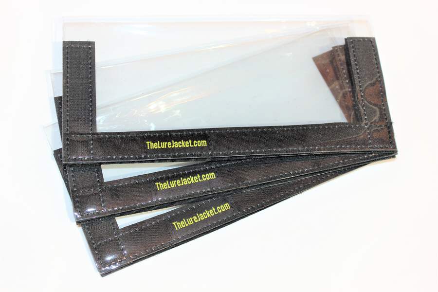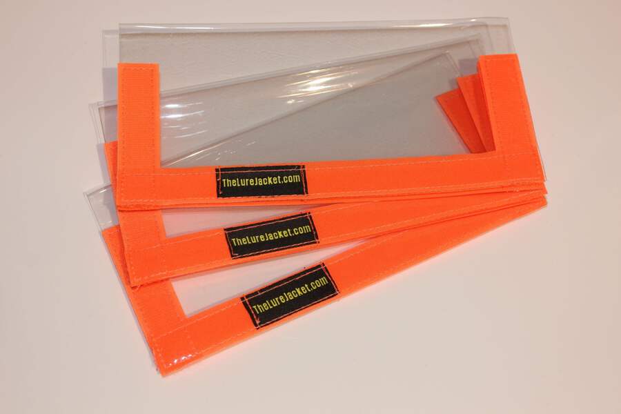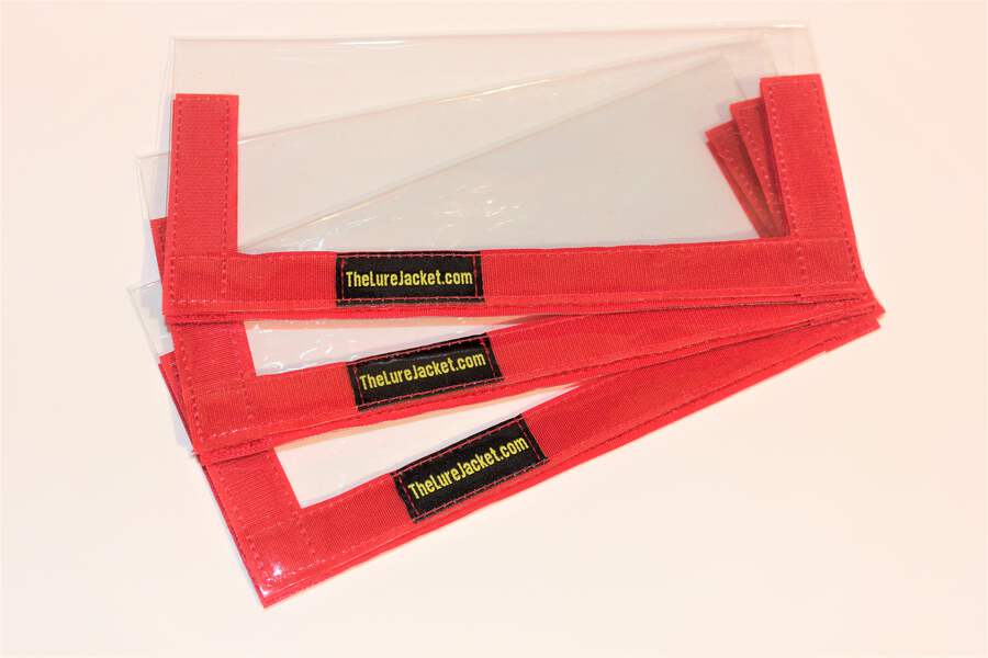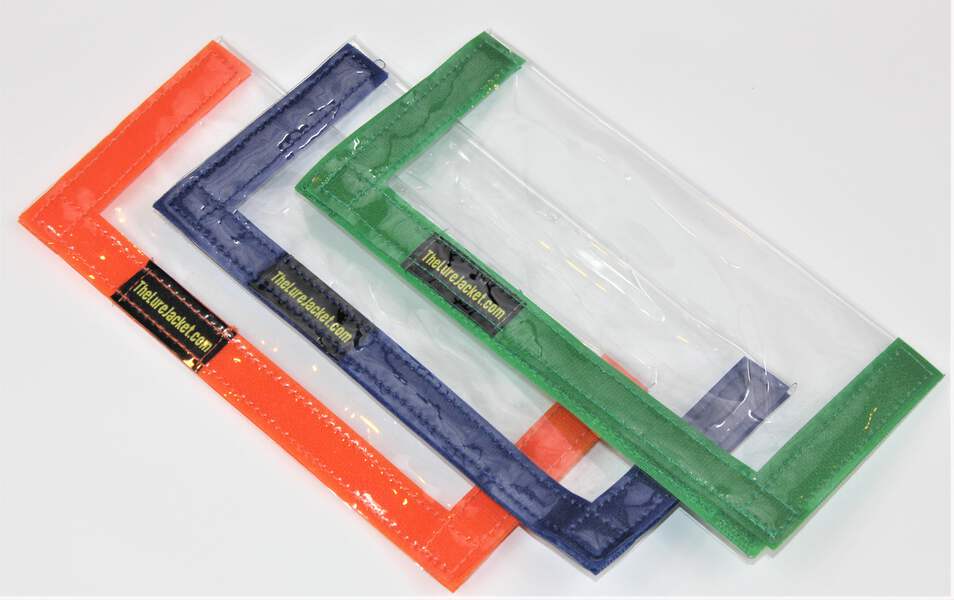 8"L x 8"W open; (8"L x 4"W closed) - Clear PVC vinyl with sewn hook and loop (comparable to Velcro) fasteners in various colors sold as a convenient 3-pack. Water proof, tough and durable, perfect for any fisherman's tackle box! See-through design so you can see what's on your line!