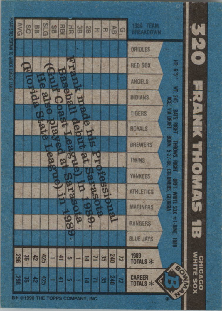 1990 Bowman #320 Frank Thomas RC Rookie Card White Sox - NM-MT