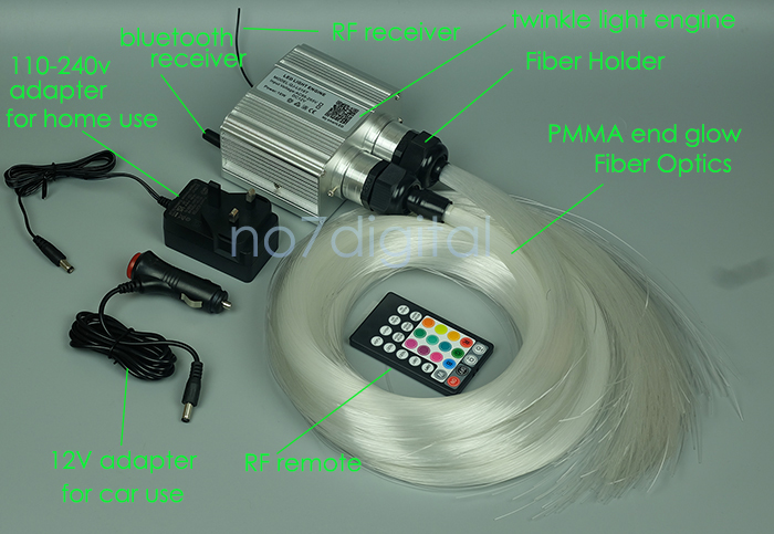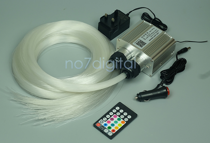 source, 1x remote, 1xAC adapter, two bundles of optical fibers(0.75mm*350pcs, about 3 meters in length).