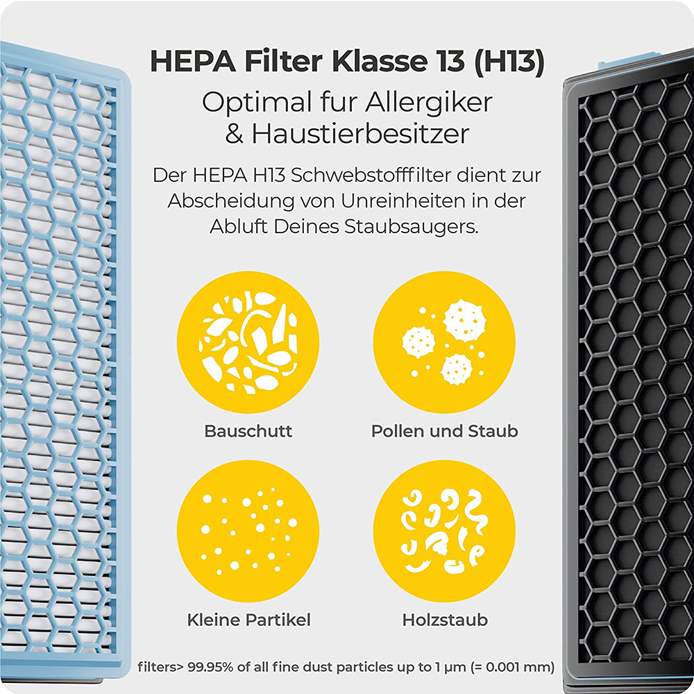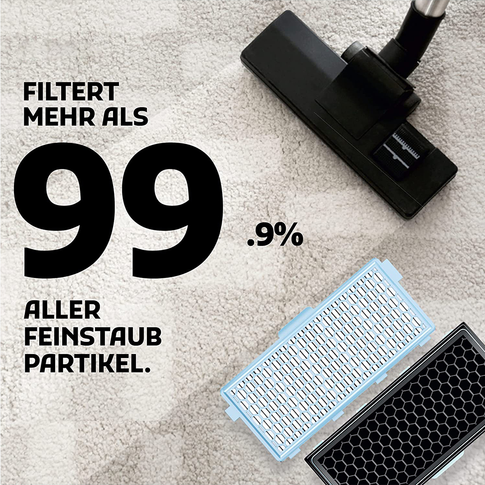 HEPA-Filter sorgt für reine Luft und filtert bis zu 99,95% aller Feinstaubpartikel bis 1µm (0,001mm) wie Staub, Bakterien, Rauchpartikel, Der Einsatz von HEPA-Filtern im Staubsauger ist besonders in Kleinkinder- und Allergikerhaushalten empfehlenswert.