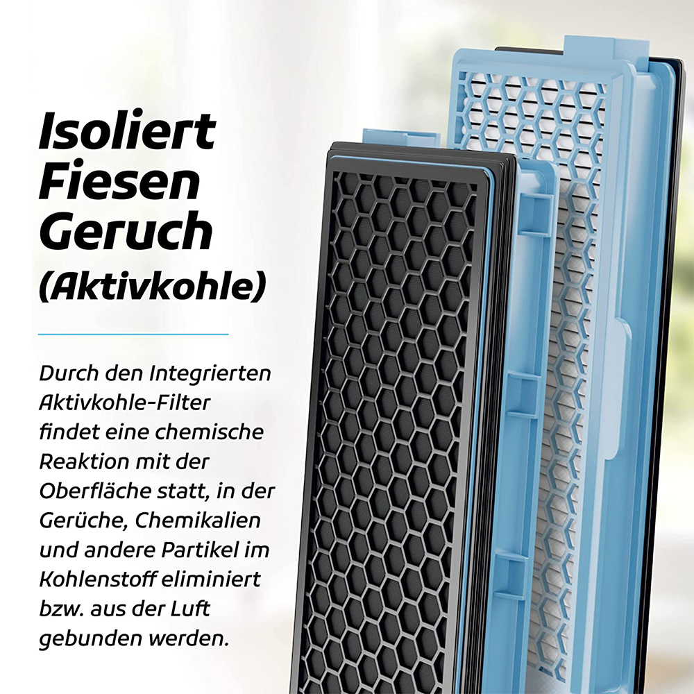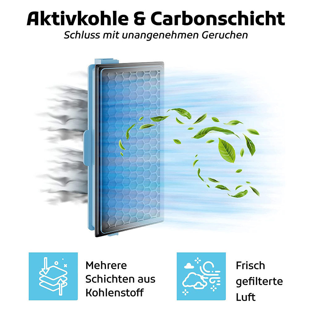Die spezielle Aktivekohlefilterschicht filtert unangenehme Gerüche aus der Luft und ist für Haustier-Haushalte geeignet.