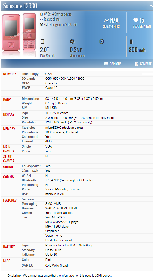 | Samsung GT-E2330 Pink 0.3MP FM Radio GSM 2G Quadband Slider Cell Phone Mobile Brand: Samsung Model: GT-E2330 Condition: New in Box Color(s): Pink Language(s): English SIM: Mini-SIM (not Micro-SIM or Nano-SIM) Simlock: Factory Unlocked to accept any SIM Network: GSM (2G) 850/900/1800/1900 Compatibility: Please make sure to check if your Cellular Carrier provides the above supported Network Frequency Bands of this phone before purchase as we do not accept any return for network incompatibility issues. Note(s): The English User Manual (PDF) of this phone by Samsung is available upon request. Contents: Cell Phone, Removable Battery (800mAh), Power Adapter, USB Cable, Chinese Documentation |