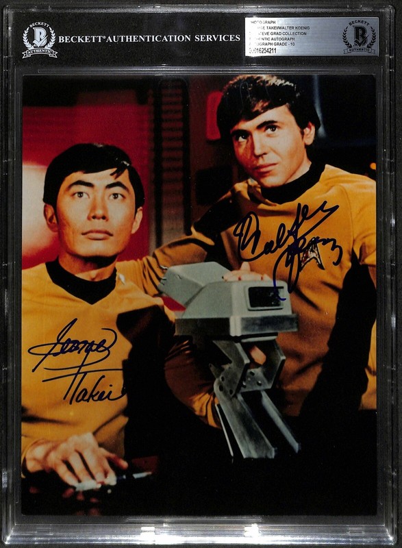 Autographed 8X10 photograph signed in blue permanent marker by actors George Takei (Sulu) and Walter Koenig (Chekov) from the original Star Trek tv series. From the Steve Grad Autograph Collection and obtained in person by Steve in the mid 1990’s. The autographs have been authenticated and graded a perfect 10 by Beckett Authentication Services.