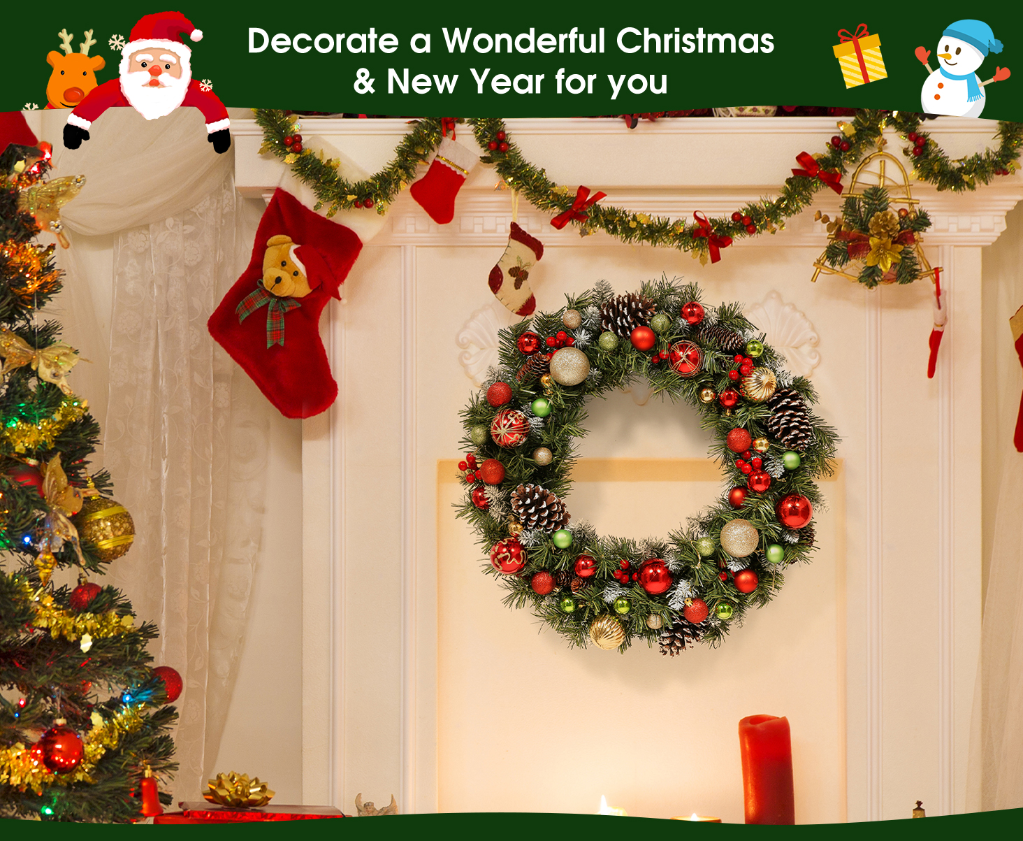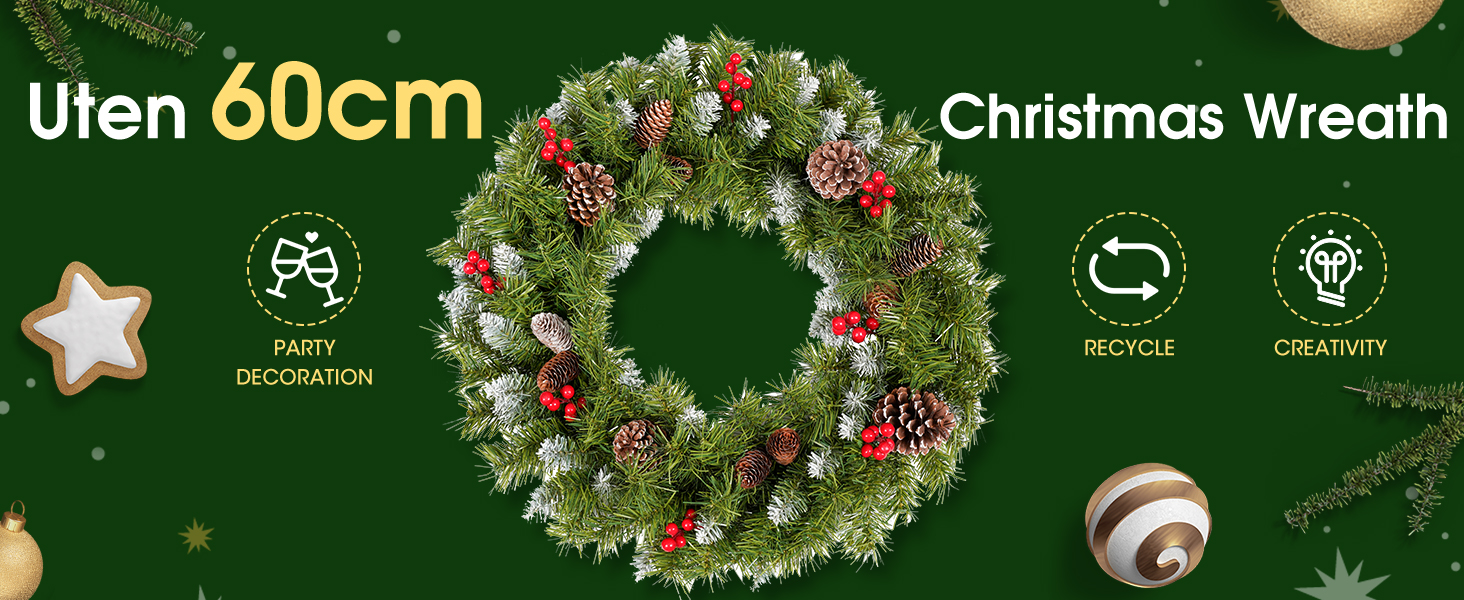 This wreath is suitable as an indoor or outdoor Christmas decoration, hang anywhere you want, such as the front door, porch, window, wall, fireplace, to add a festive atmosphere to any area of the house. It is also a Christmas decorations for most venues.
