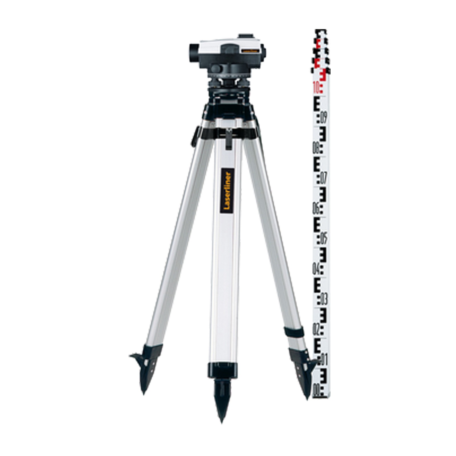 Robustes und zuverlässiges Nivellierinstrument im Set mit Kuppel-Alu-Leichtstativ und Teleskop-Nivellierlatte