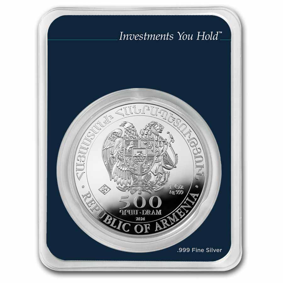 The Armenian Noah's Ark silver coin series honors one of the most iconic stories of the Bible. Add this 2024 Armenia 1 oz Silver 500 Drams Noah's Ark MintDirect® single coin to your cart today!
