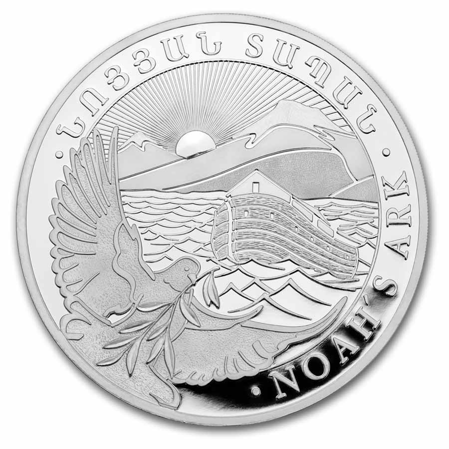 - Reverse: Designed by Eduard Kurghinyan and displays a dove in flight with an olive branch with Noahs Ark floating on the flood waters in front of Mt. Ararat with the rising sun in the background.