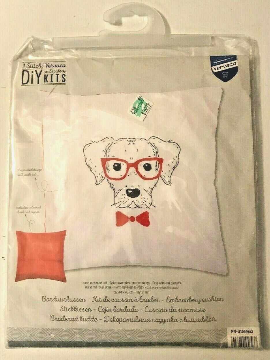 VERVACO Dog with Red Glasses Embroidery Cushion DIY Kit 16" x 16" NEW MSRP $40