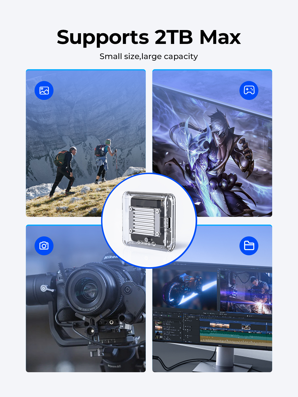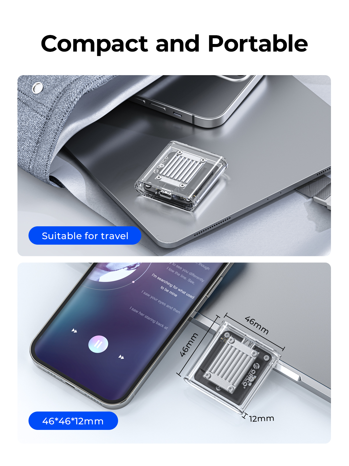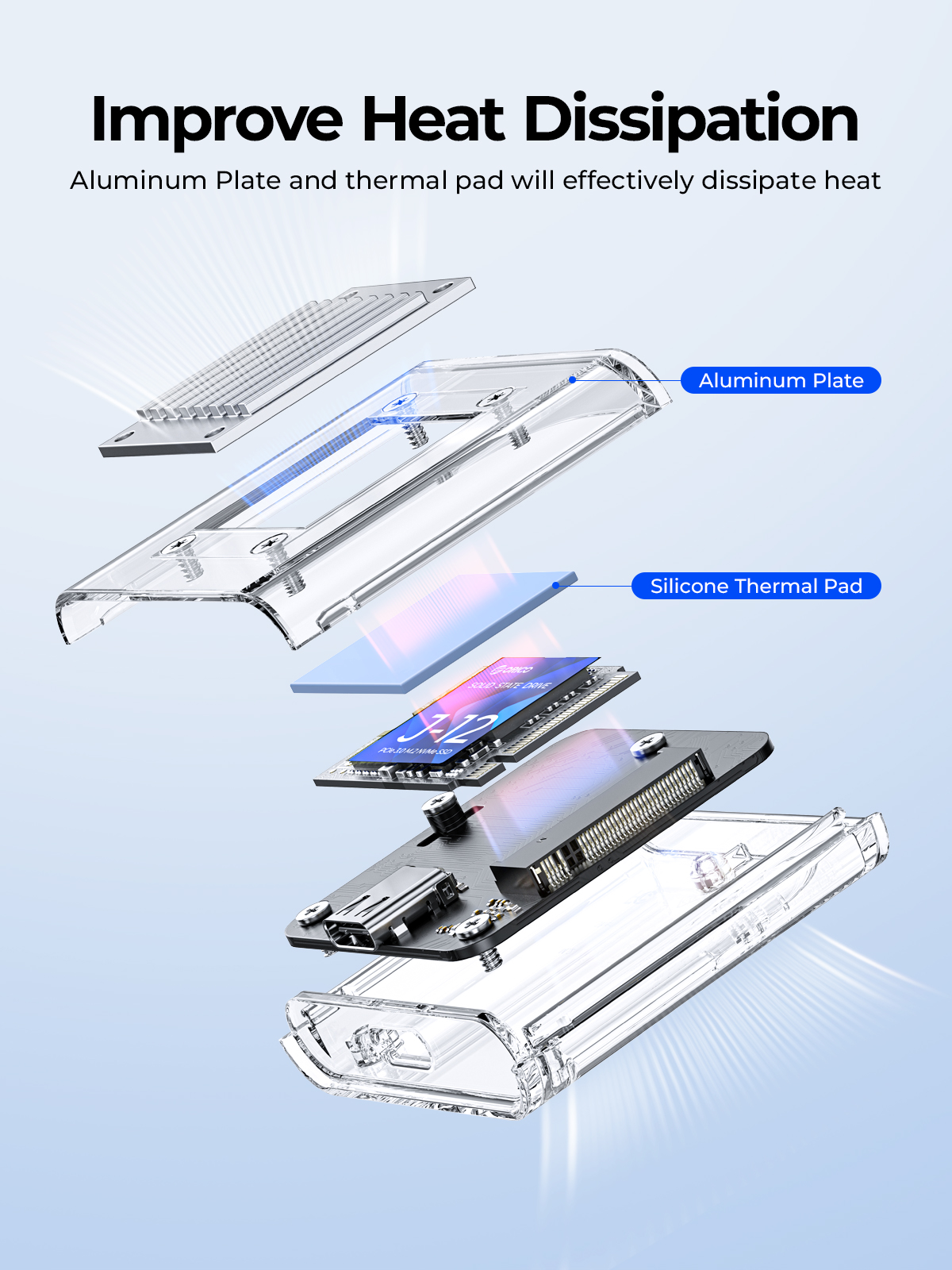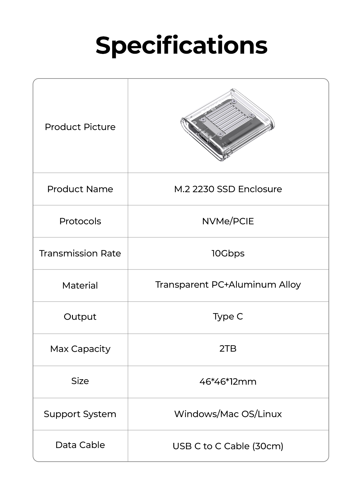 This product is an M.2 NVME SSD hard disk enclosure, which is made entirely of transparent PC and is suitable for 2230 size M.2 NVME protocol SSDs. Transparent technology style, high-quality workmanship and great hand feel. Exquisite and compact, you can put it in your pocket at any time. Tool-free installation is easy to operate, allowing users who dismantle old laptops to fully resurrect idle hard drives, and provide solutions for people who need data storage, transfer, computer expansion, etc.