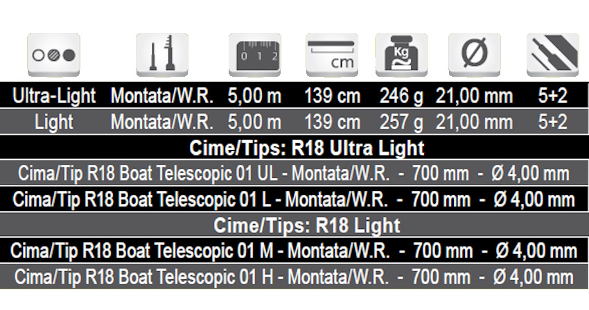 Máximas prestaciones para la nueva joya de la marca R18, pura tecnología, muy ligera y con un diámetro de sólo 21mm. Los Boat Telescópico 01 están equipados con dos puntas SoHo, las innovadoras puntas semihuecas que ofrecen una gran sensibilidad y ligereza, ¡únicas en su categoría! Una punta UL y L para la versión Ultra Light y una M y H para la versión Light. Están equipados con anillas SiC Titanium, ligeras y resistentes al agua salada y un portacarretes Fuji NS.