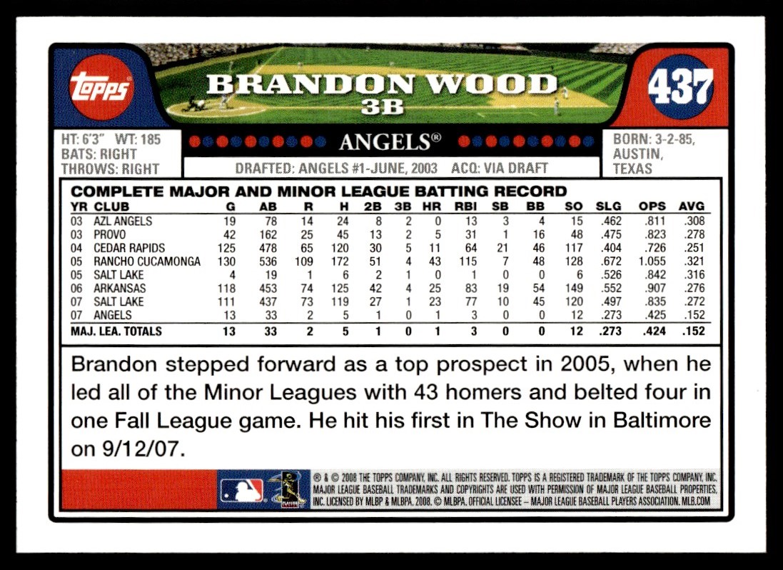 | 2008 Topps Baseball Brandon Wood Auto Los Angeles Angels #437 Signed |