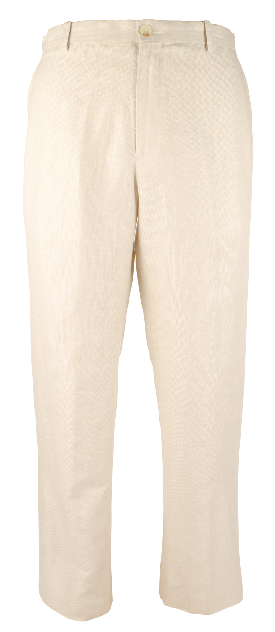 54% Linen, 46%Cotton. Belt loops, Zip fly with button closure.Flat front.