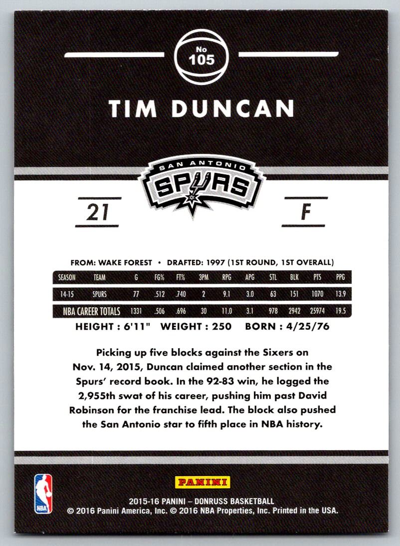 2015-16 PANINI DONRUSS BASKETBALL 2015-16 TIM DUNCAN SAN ANTONIO SPURS #105