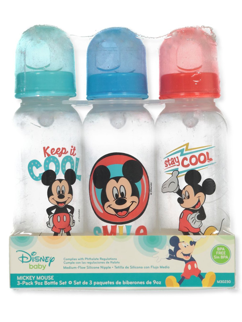 Bring a dose of Disney to mealtime with this 3-pack of 9 oz. bottles, featuring Mickey Mouse! Disney Mickey Mouse 3-pack baby bottles Medium flow silicone nipples Designs as shown BPA free Imported