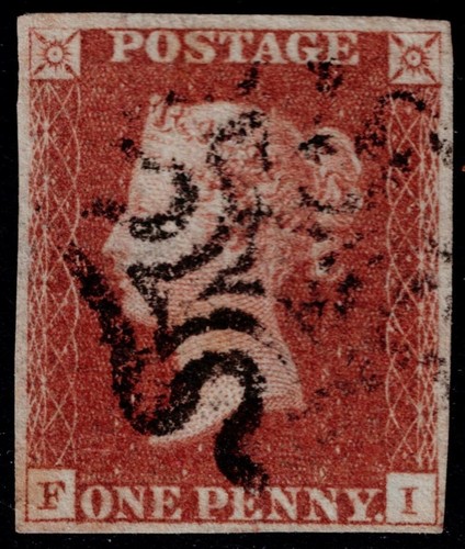 A very good/fine, four-margin 1d Red-Brown from Black plate 5, lettered FI, cancelled by a light Maltese Cross. Miniscule thin spot, but fine appearance. SG7 Cat. £180.00