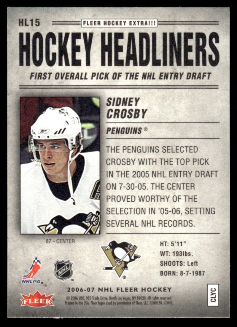 2006-07 Fleer Hockey Headliners Sidney Crosby Pittsburgh Penguins #HL15
