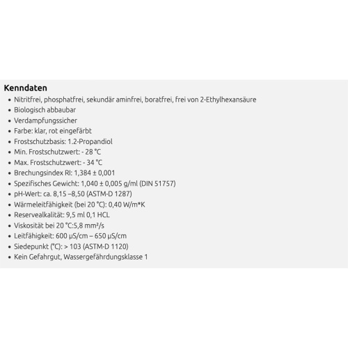 Das Solarflüssigkeit-Fertiggemisch ist biologisch abbaubar und nitritfrei, phosphatfrei, sekundär aminfrei sowie boratfrei.