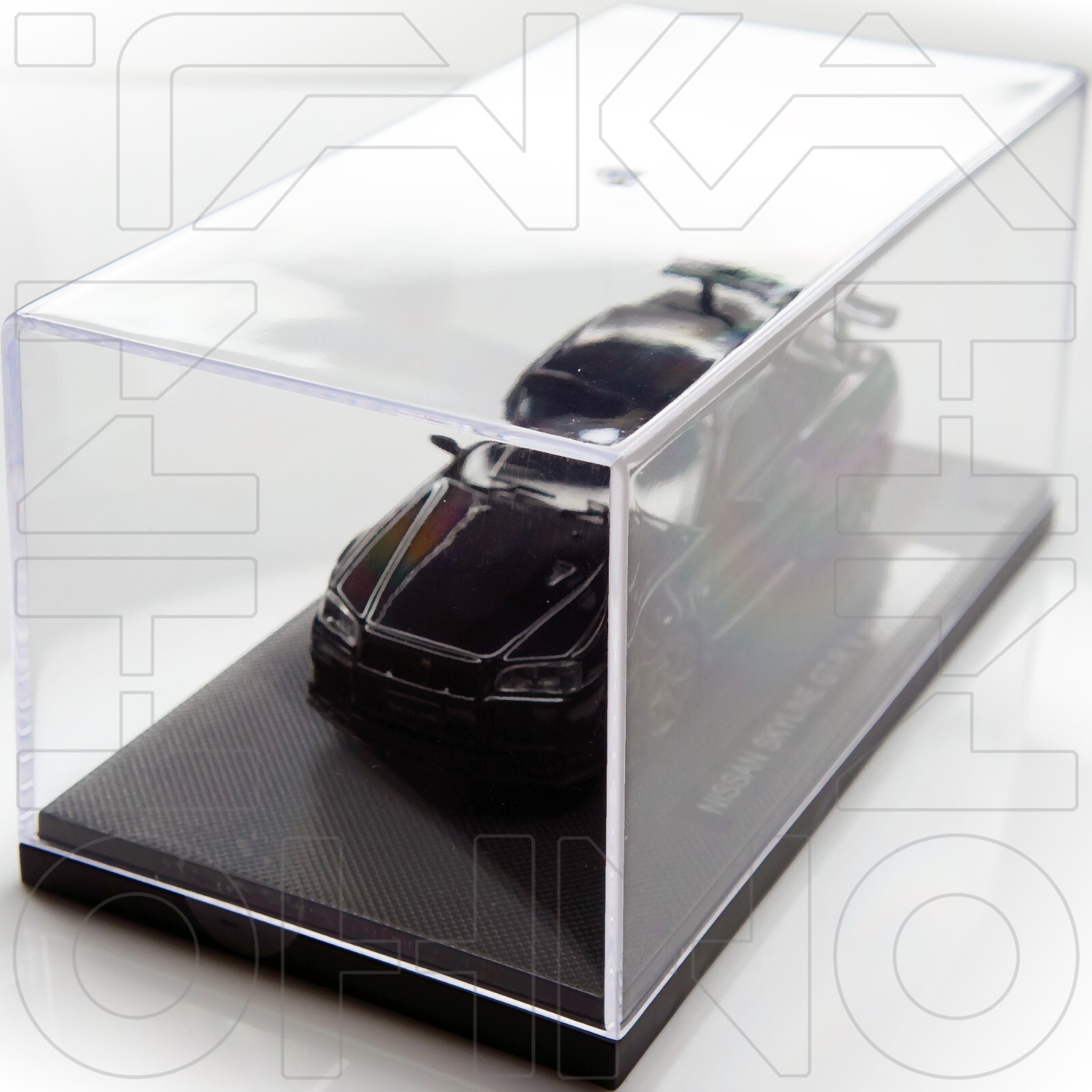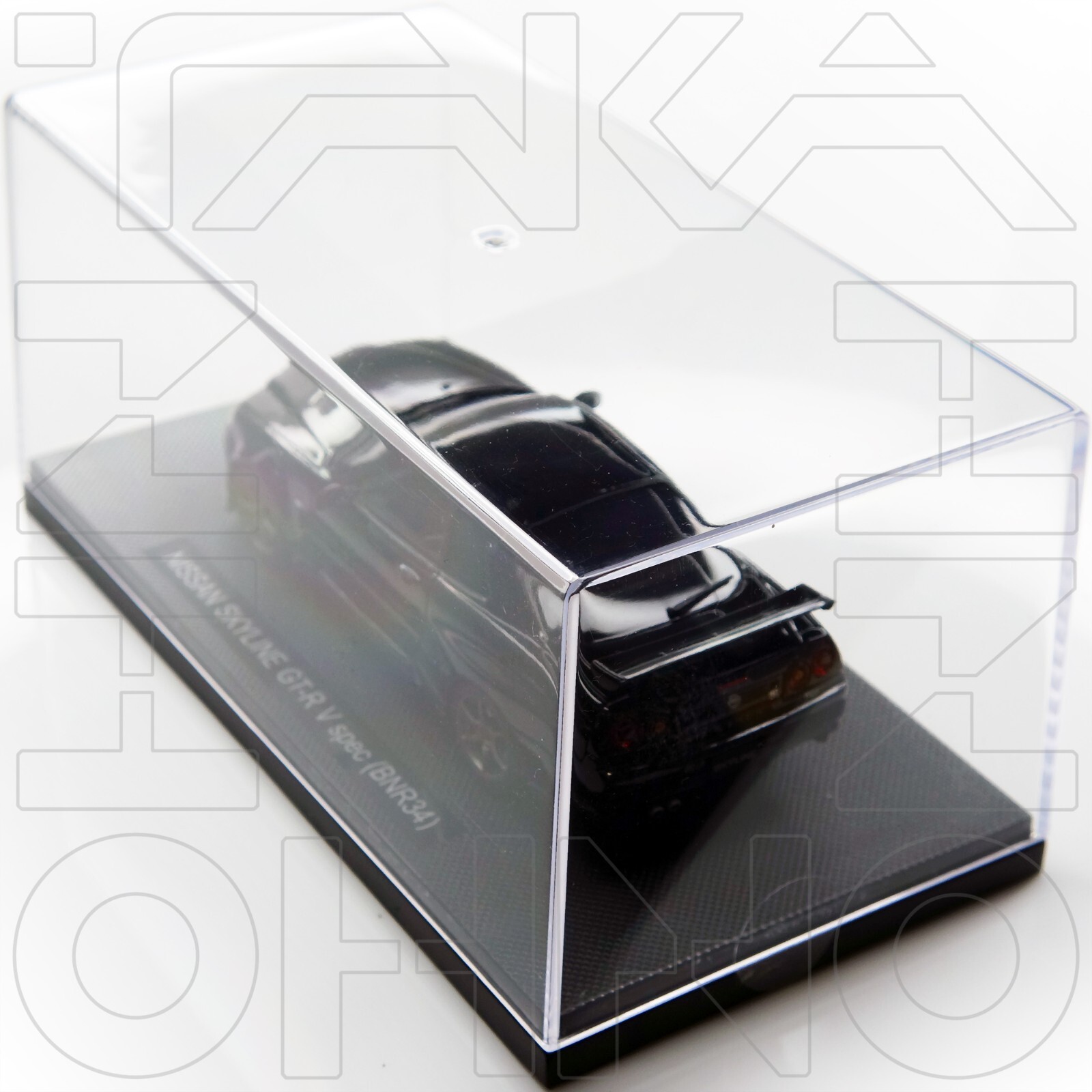 The base is exclusive for this model with "NISSAN SKYLINE GT-R VSPEC (BNR34)" printed in white ink on the left side of the model. MMP emboss logo on the bottom surface.