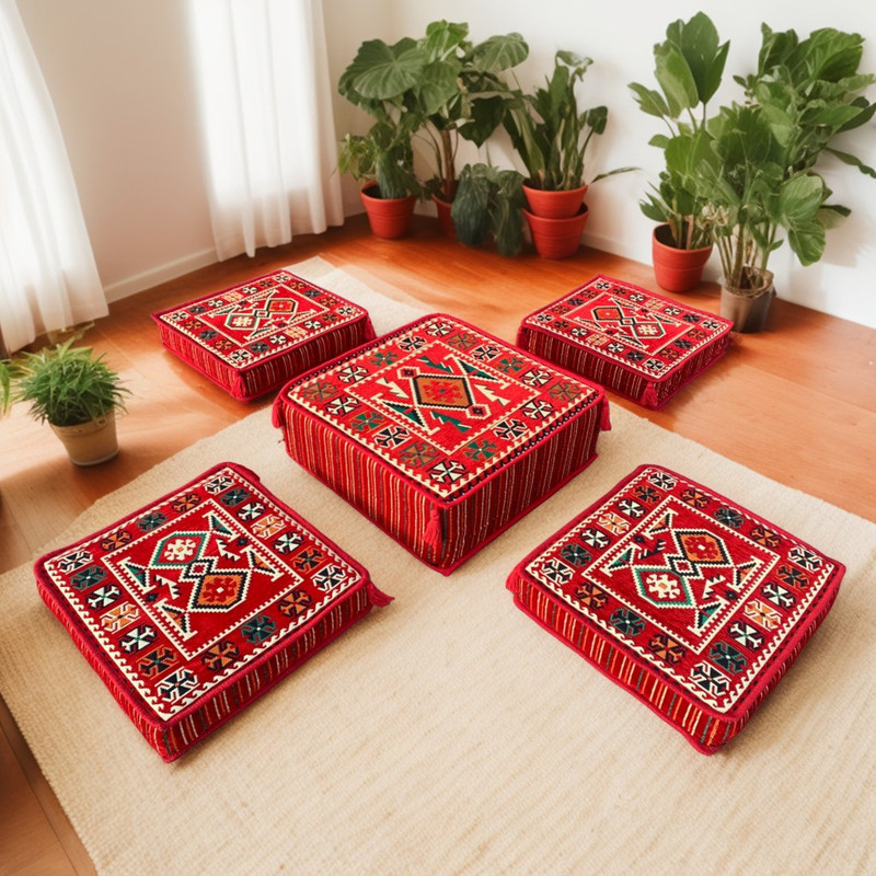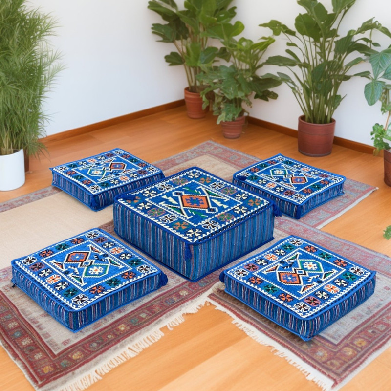 Elevate your space with our 5-piece Handmade Floor Seating Cushion Set, featuring a large pouffe and four identical square floor cushions. Embrace a Moroccan-Boho vibe with this versatile set that adds charm and functionality to any room, whether indoors or outdoors.
