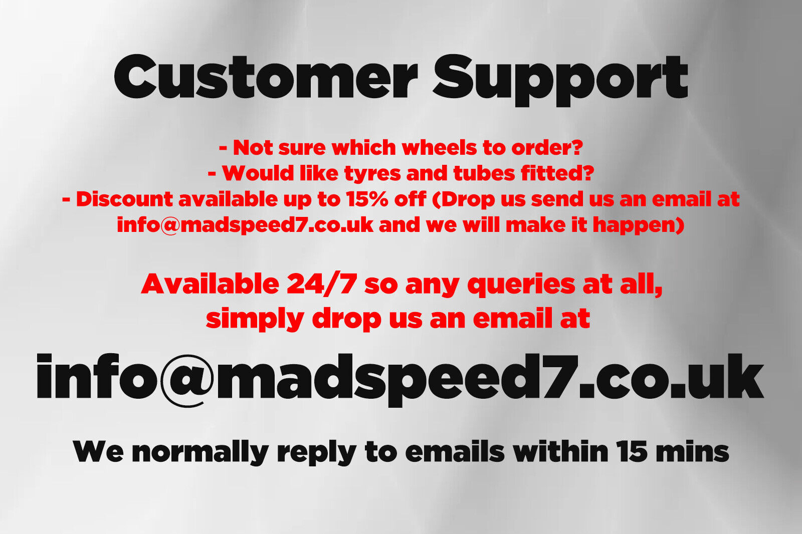 We pride ourselves in our quality so for extra peace of mind, we offer a full 1 year warranty on all our wheels (Terms and conditions apply)