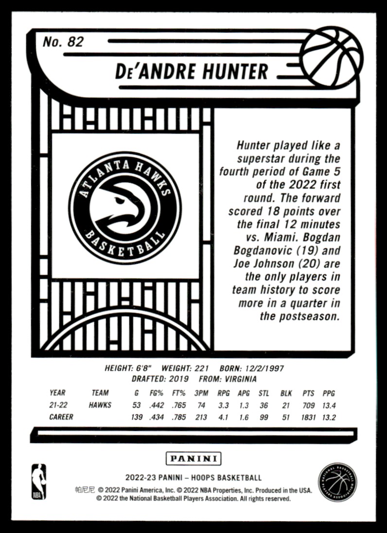 | 2022-23 Hoops De'Andre Hunter Atlanta Hawks #82 |