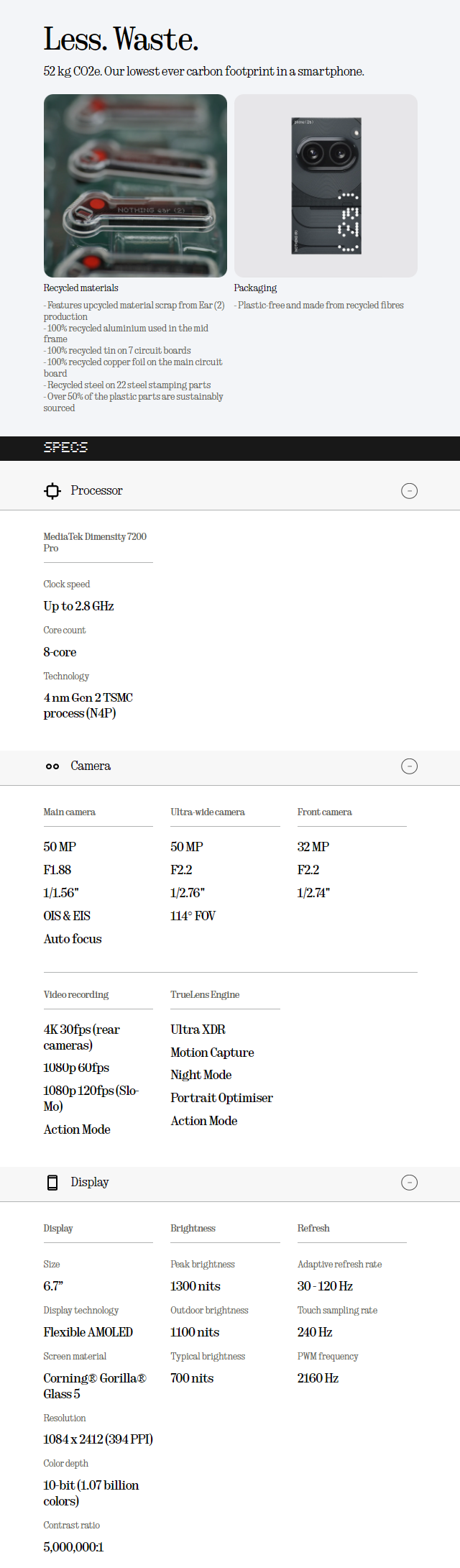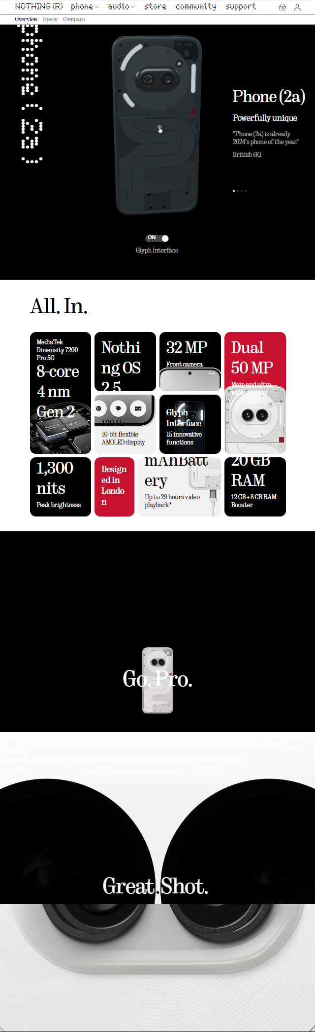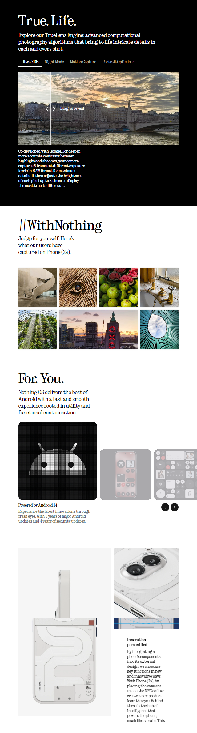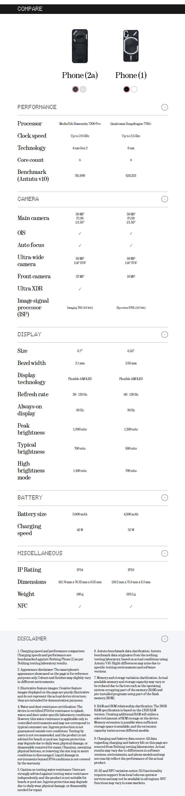 | Nothing Phone (2a) A142 12+256GB White 50MP 6.7" Dual SIM 5G Android Smartphone Brand: Nothing Model: Phone (2a) A142 Condition: New in Box Color(s): White CPU: Mediatek Dimensity 7200 Pro (4 nm) (8 Cores) GPU: Mali-G610 MC4 RAM: 12GB LPDDR5 ROM: 256GB UFS 3.1 OS: Android 14 Language(s): Multilanguage SIM: SIM 1 - Nano-SIM / SIM 2 - Nano-SIM Simlock: Factory Unlocked to accept any SIM Network: 2G bands GSM 850 / 900 / 1800 / 1900 3G bands HSDPA 800 / 850 / 900 / 1700(AWS) / 1900 / 2100 4G bands 1, 3, 4, 5, 7, 8, 18, 19, 20, 26, 28, 38, 39, 40, 41, 42, 66 5G bands 1, 3, 5, 7, 8, 20, 28, 38, 40, 41, 66, 77, 78 SA/NSA Compatibility: Please check if your wireless carrier supports this phone prior to purchase as there is no return accepted for any carrier incompatibility issues Contents: Android Smartphone, Non-Removable Battery (5000mAh), USB-C to USB-C Cable, SIM Ejector |