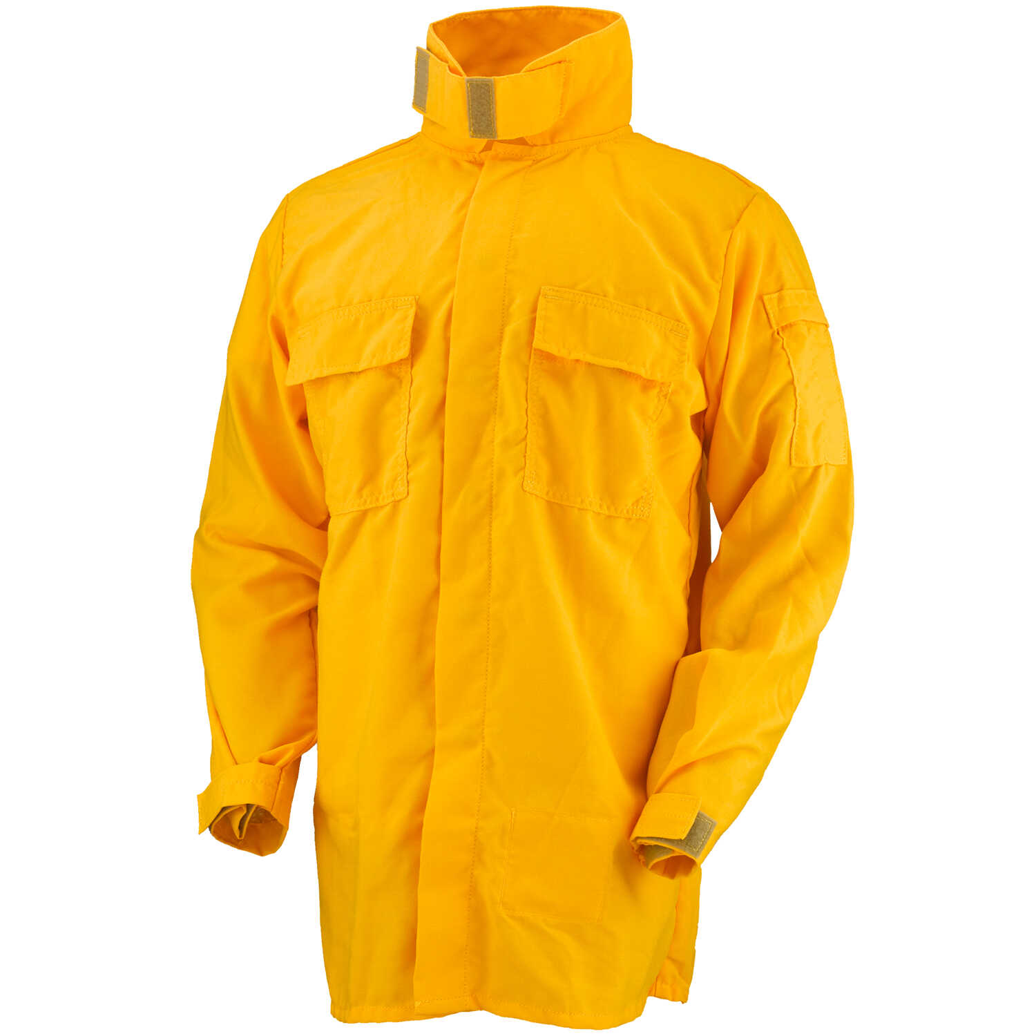 This shirt's standup collar provides excellent neck protection and comfort. Fabric-covered, nickel-plated, snap front closure. Adjustable cuffs and two breast pockets have Velcro® closures. Certified to NFPA 1977, current edition, standards for wildland fire fighting protective clothing and UL classified. Yellow.