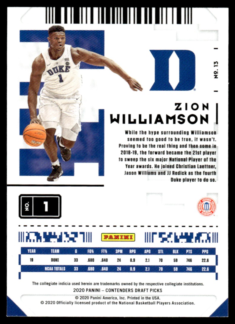 | 2020-21 Panini Contenders Draft Picks Zion Williamson Duke Blue Devils #13 |