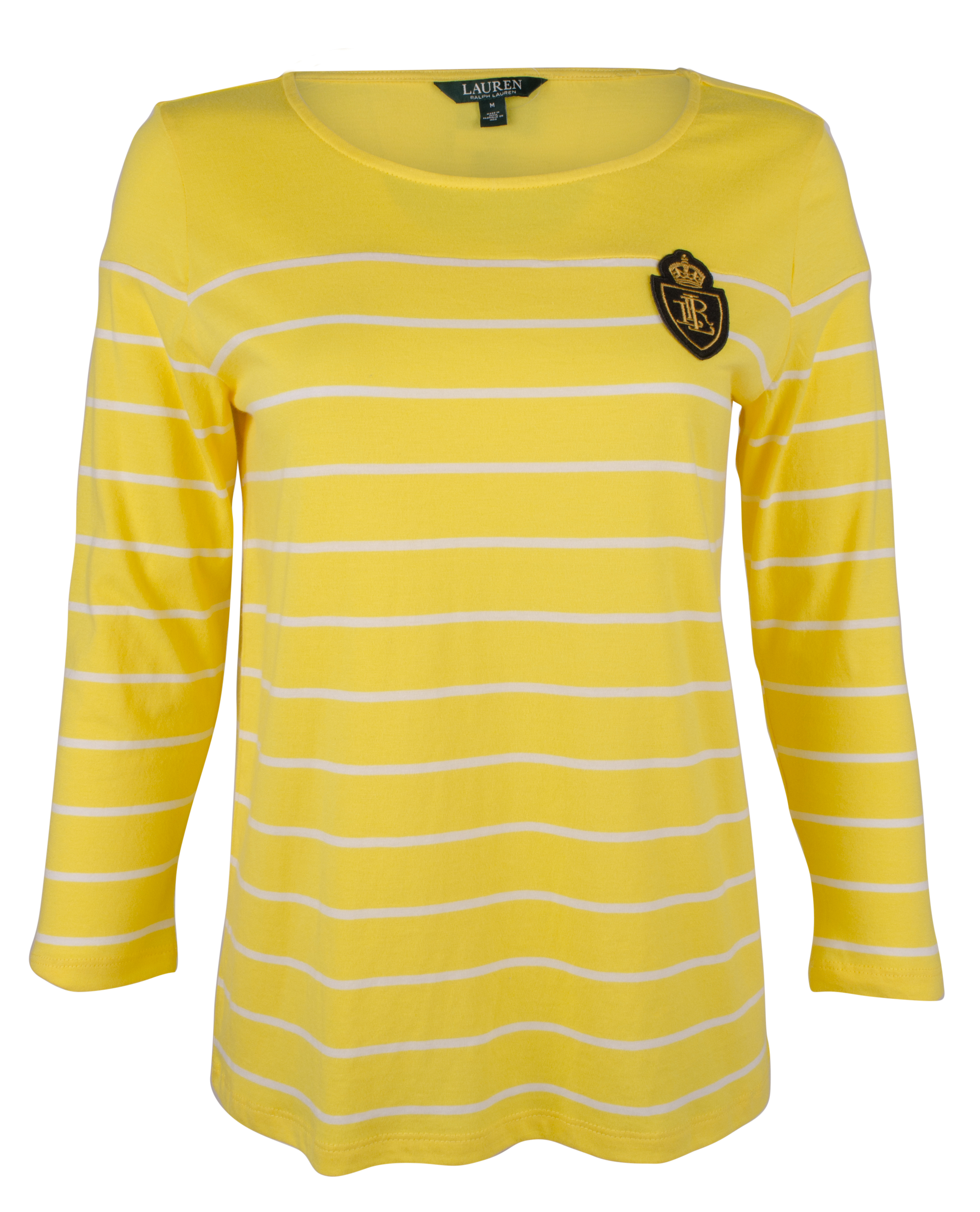 • 60% cotton, 40% modal. Soft cotton -blend fabric. Scoopneck. Three-quarter sleeves. “LRL” crest patch embroidered at left chest. Machine washable; Imported.