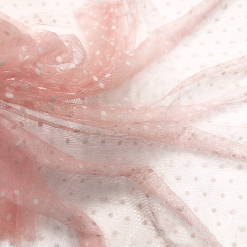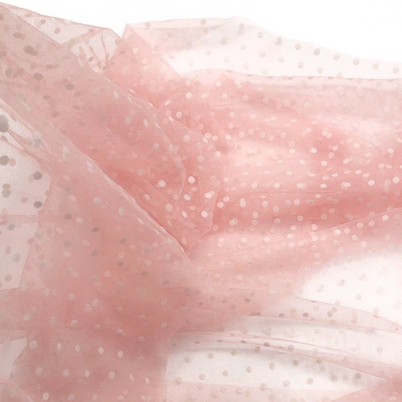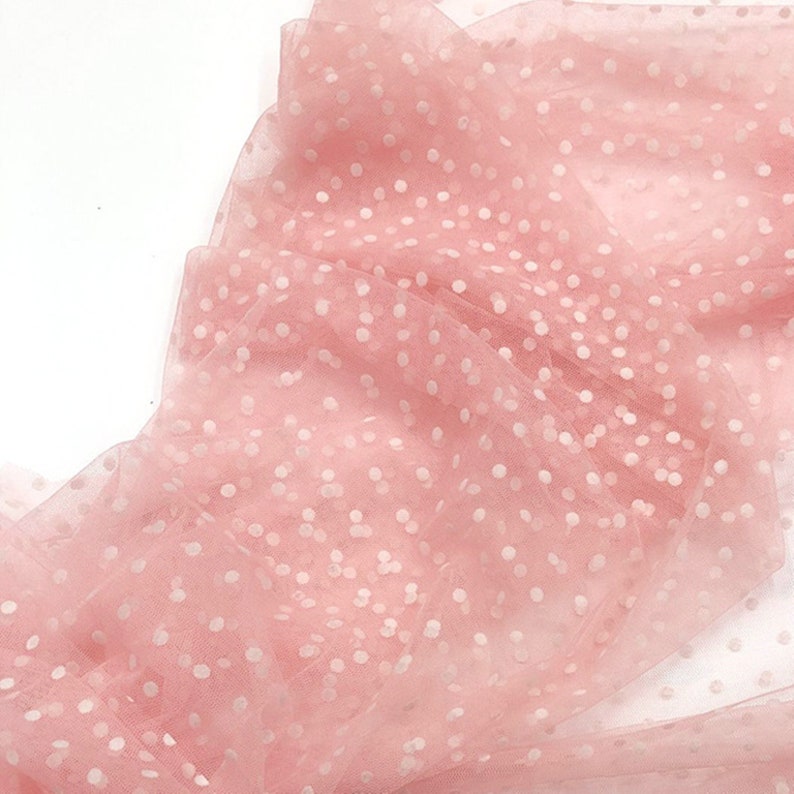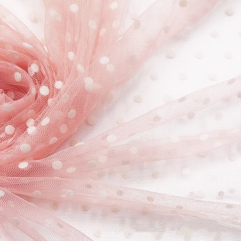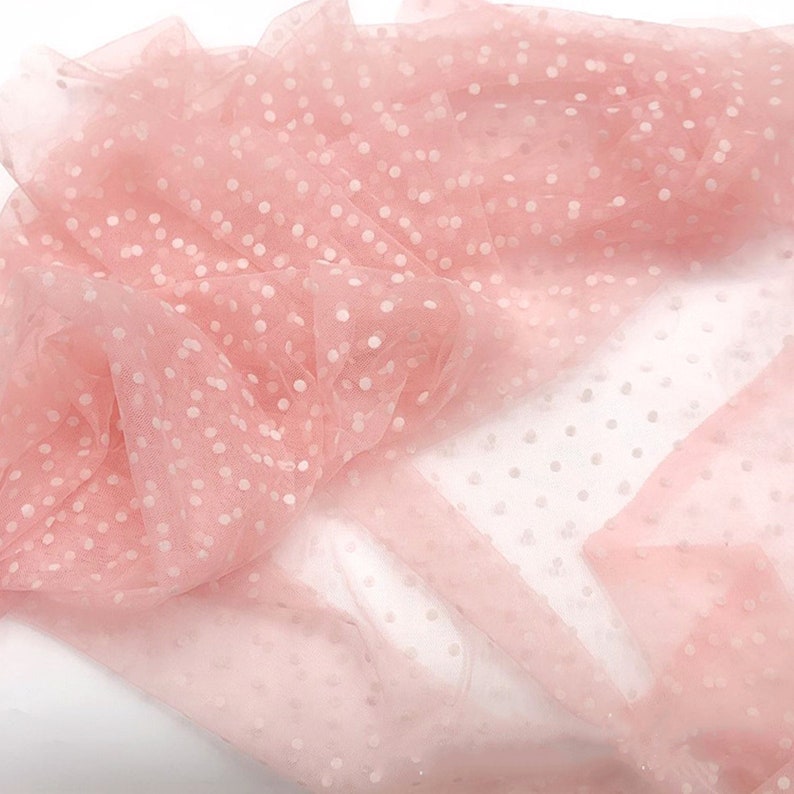 Soft pink tulle fabric with off white flocked polka dot, soft and beautiful, perfect for weddings, party decoration, girl dress, bridal supplies..