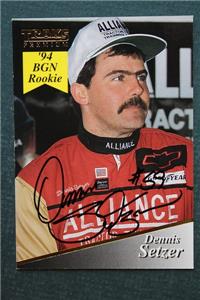 Up for bids is a 2 1/2" wide by 3 1/2" long 1994 Traks Nascar Racing card # 41 that has been signed / autographed by Nascar Driver Dennis Setzer -The card features a great image of Setzer with a large black ink signature signed on front with his car number added too-Card shows only light wear and the signature is strong - A nice item with a 100% authentic signature. Postage on this item is $ 4.95.