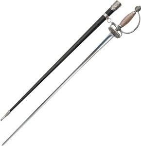 Construction: 1060 Carbon Steel; Overall: 37.875"; Blade: 30.75" l Carbon Steel l Standard Edge; Other Info: Triangular shaped blade. Wire wrapped handle with a light, but strong knuckle guard. The hilt features two shells with functional finger loops. Leather scabbard with an intricately decorated throat and chape. Boxed.