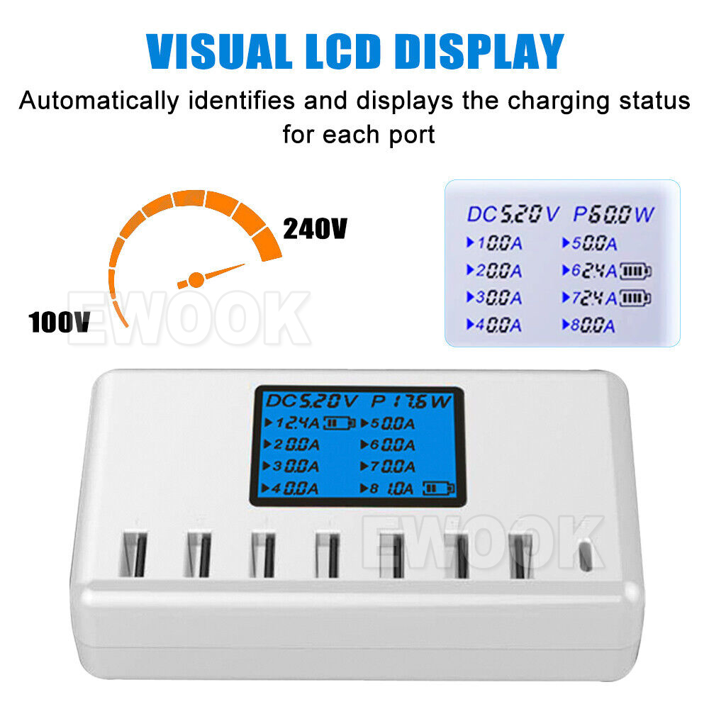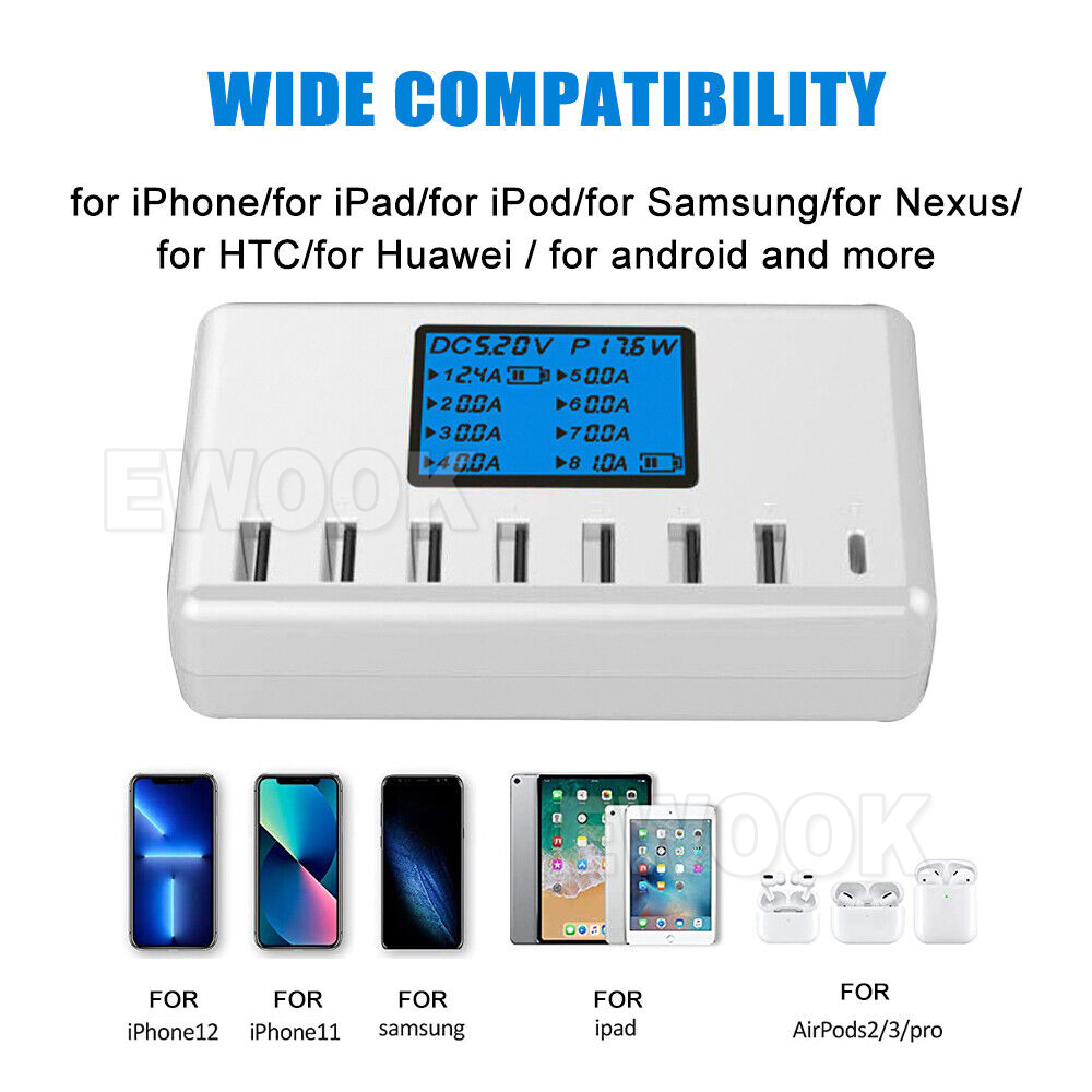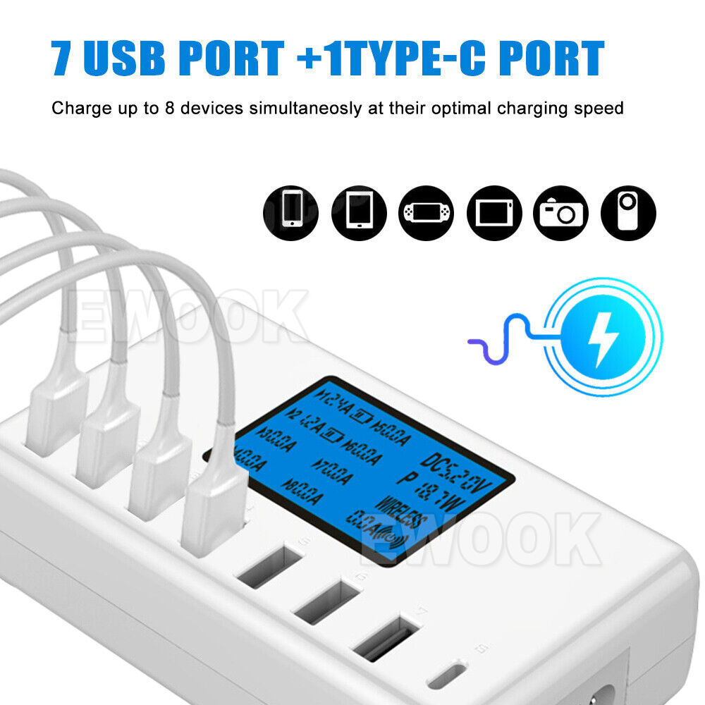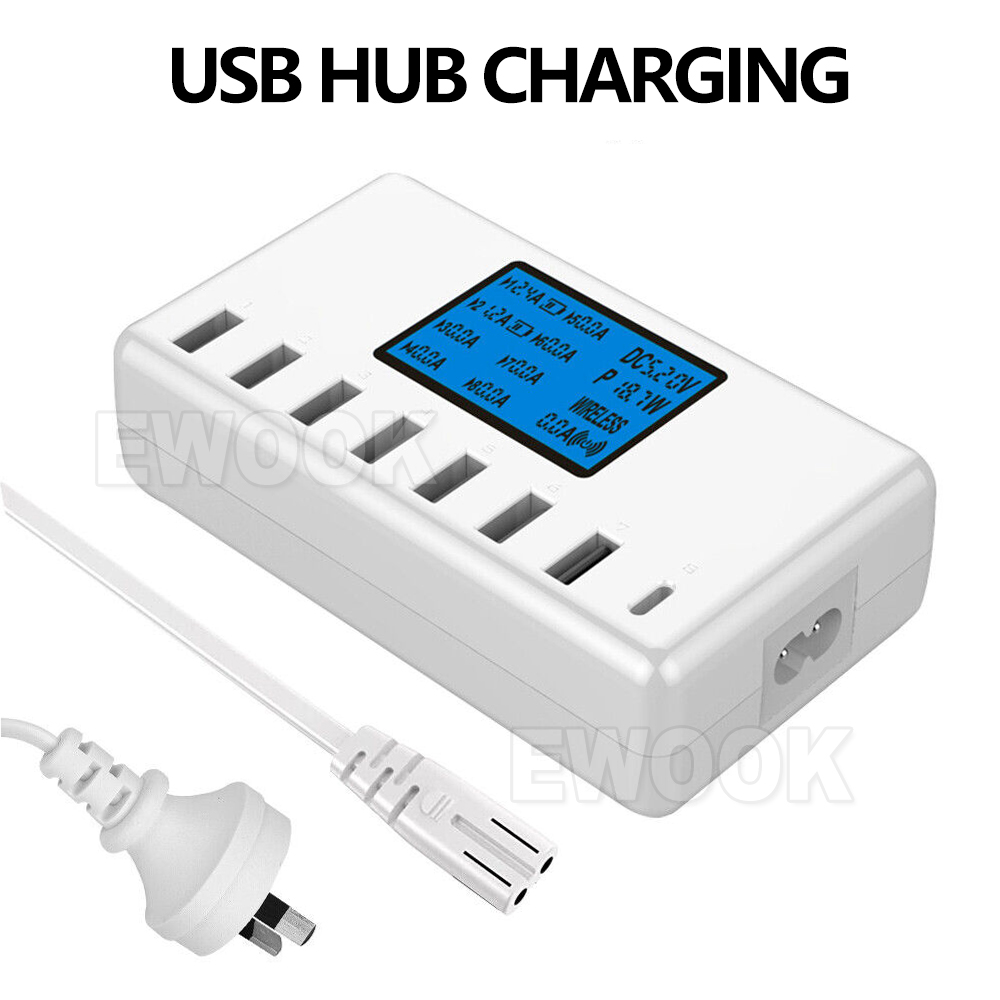 - Features: - Ideal for home, office, travel and other indoor uses - 7 USB ports with various output capacity and 1 type c port to meet your needs - Compatible with all smartphones like for iphone Samsung Xiaomi Huawei LG ZTE Lenovo HTC Sony Google and tablet PC Camera MP3 MP4 Player PSP with USB port,and type c port for Macbook. Charge up to 4devices at the same time. - 0.8M wire Comes with led display screen to show charging status clearly,comes with a smart LED screen to check the status - Compact design,small size and light weight automatical current matching,more protection - Specifications: - Input Voltage: AC 100-240V 50-60Hz - Output :5V/2.4A(Max) - Output power : 5V/8A 40W(Max) - Type C Out: DC 5V/2.4A(Max) - Color: White - Plug standard: AU Plug - Material: ABS + PC - Pay By 1pm, Have your item dispatched today. - 12 Months Warranty. - Sydney local Stock, Fast deliver!