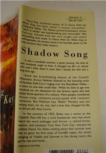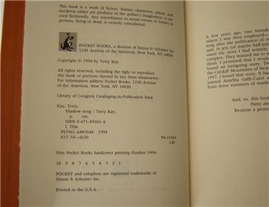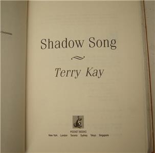 This listing is for the above book "SHADOW SONG" written by TERRY KAY and published by Pocket Books in (1994). This is an "unread" FIRST EDITION FIRST PRINTING hardcover copy with dustjacket (I know it's unread because I purchased it new and never got to read it). The book is in NEAR FINE condition (it would be Fine except for the black remainder line on the bottom edge and a slight lean to the left) and the Dustjacket is in FINE condition. The book is excellent on the exterior with a nice spine and sharp outside corners and it's just as nice on the inside with clean white pages. The dustjacket is also in great shape. It's a lovely copy but please (check the photos to judge the condition for yourself). While you're here I hope you'll take the time to look at our other book listings.