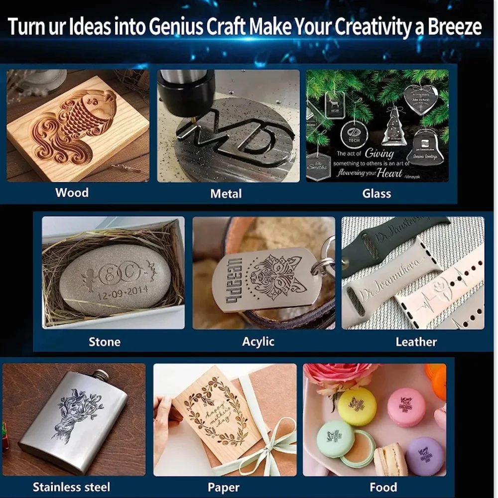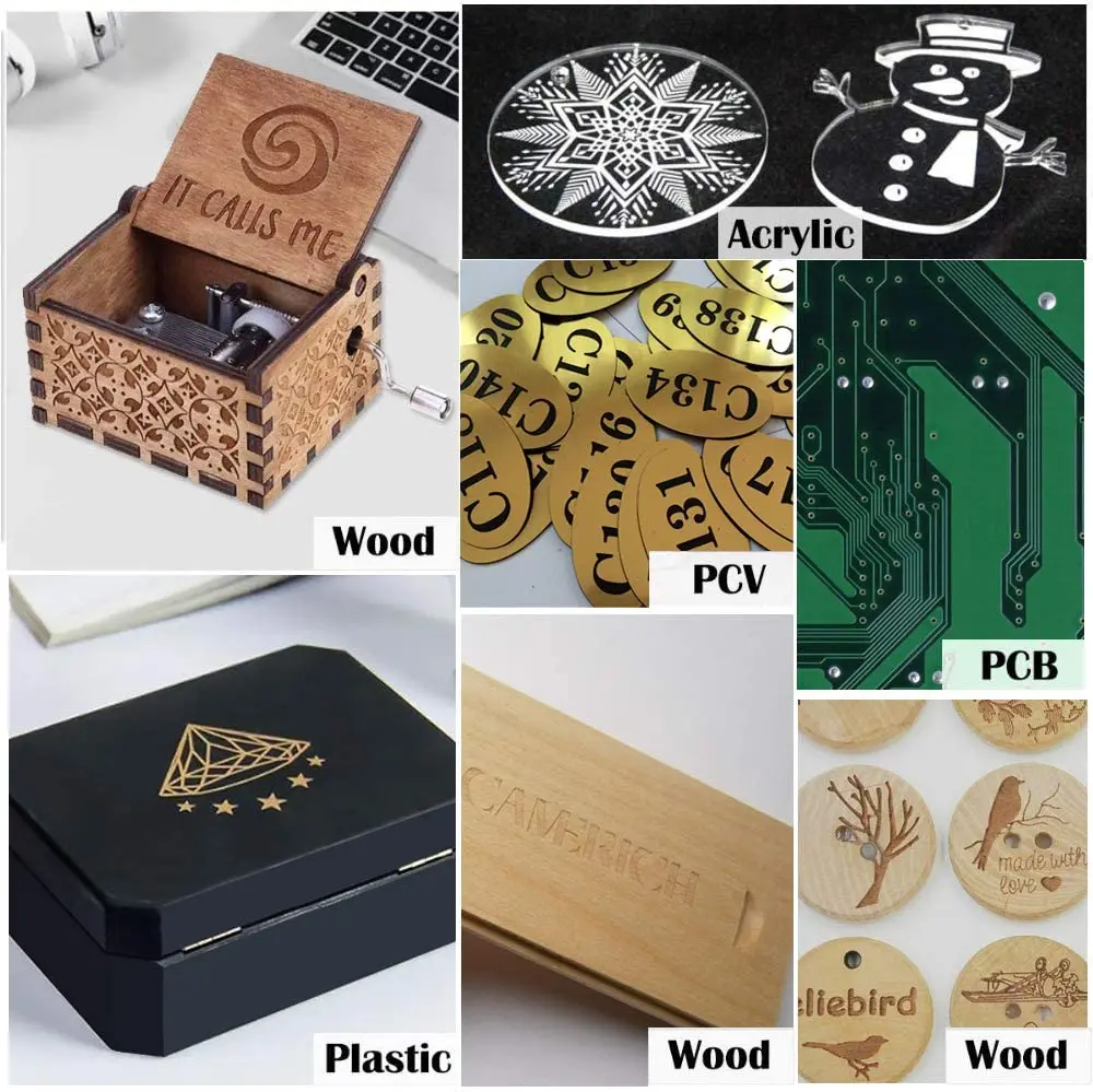 Carving Objects: All wood, bamboo, paper, plastic, leather, PCB board, aluminum oxide, stainless steel, non-reflective plating and lacquered metal, glass
