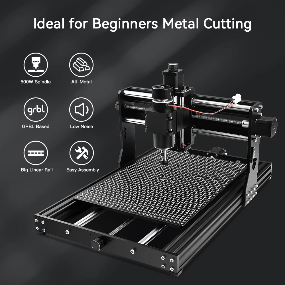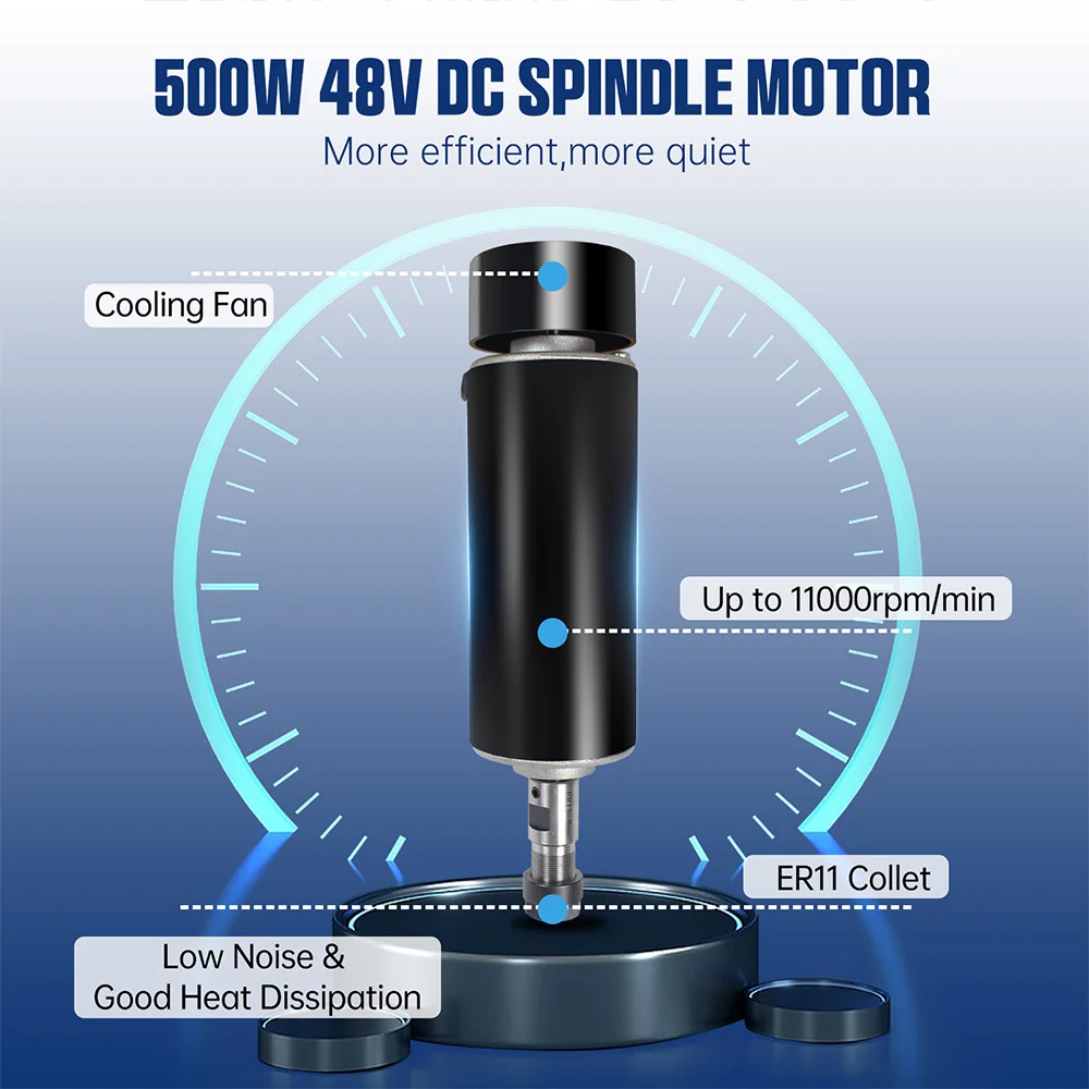 This 4030PRO CNC machine is solidly built with all-metal body structure and upgraded 500W 52mm spindle with E11 collet, more powerful and higher efficiency, making it possible to cut stainless steel, aluminum and other metals