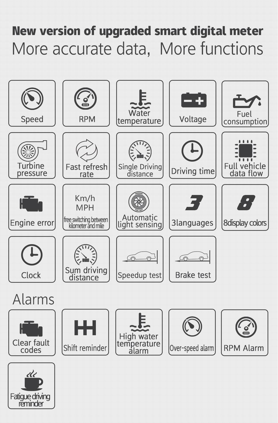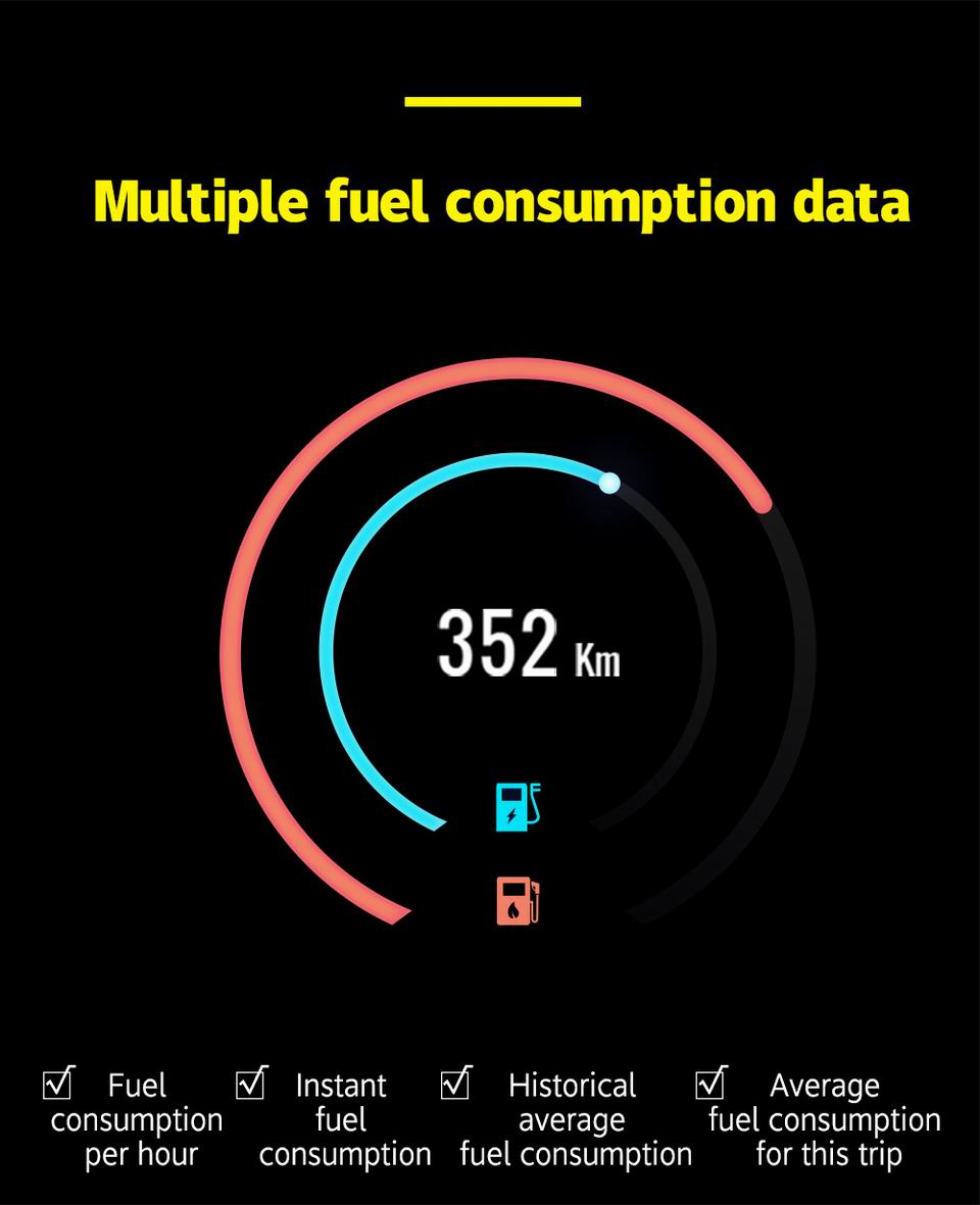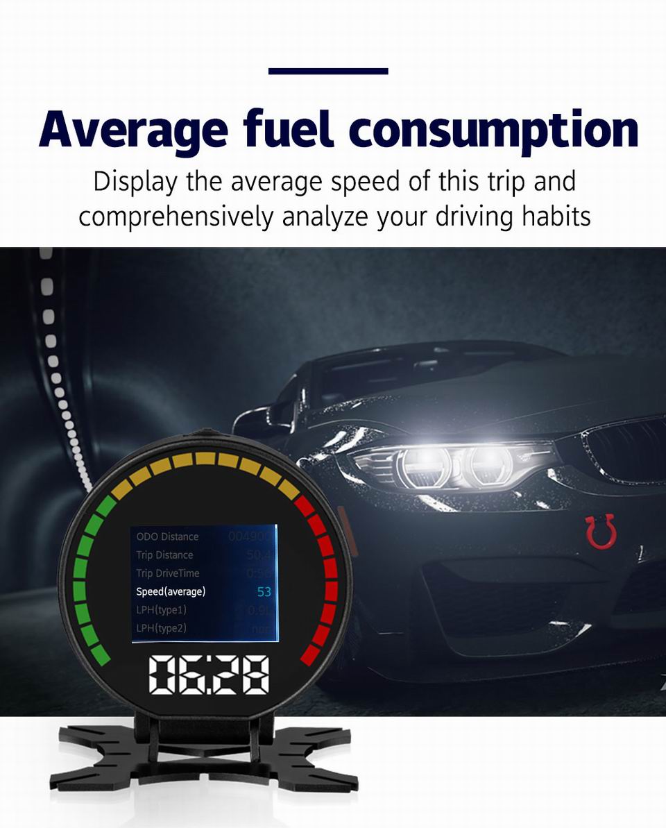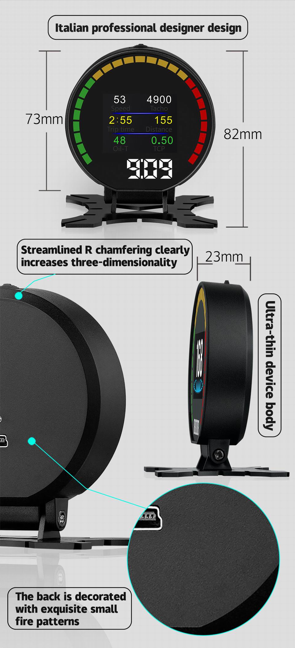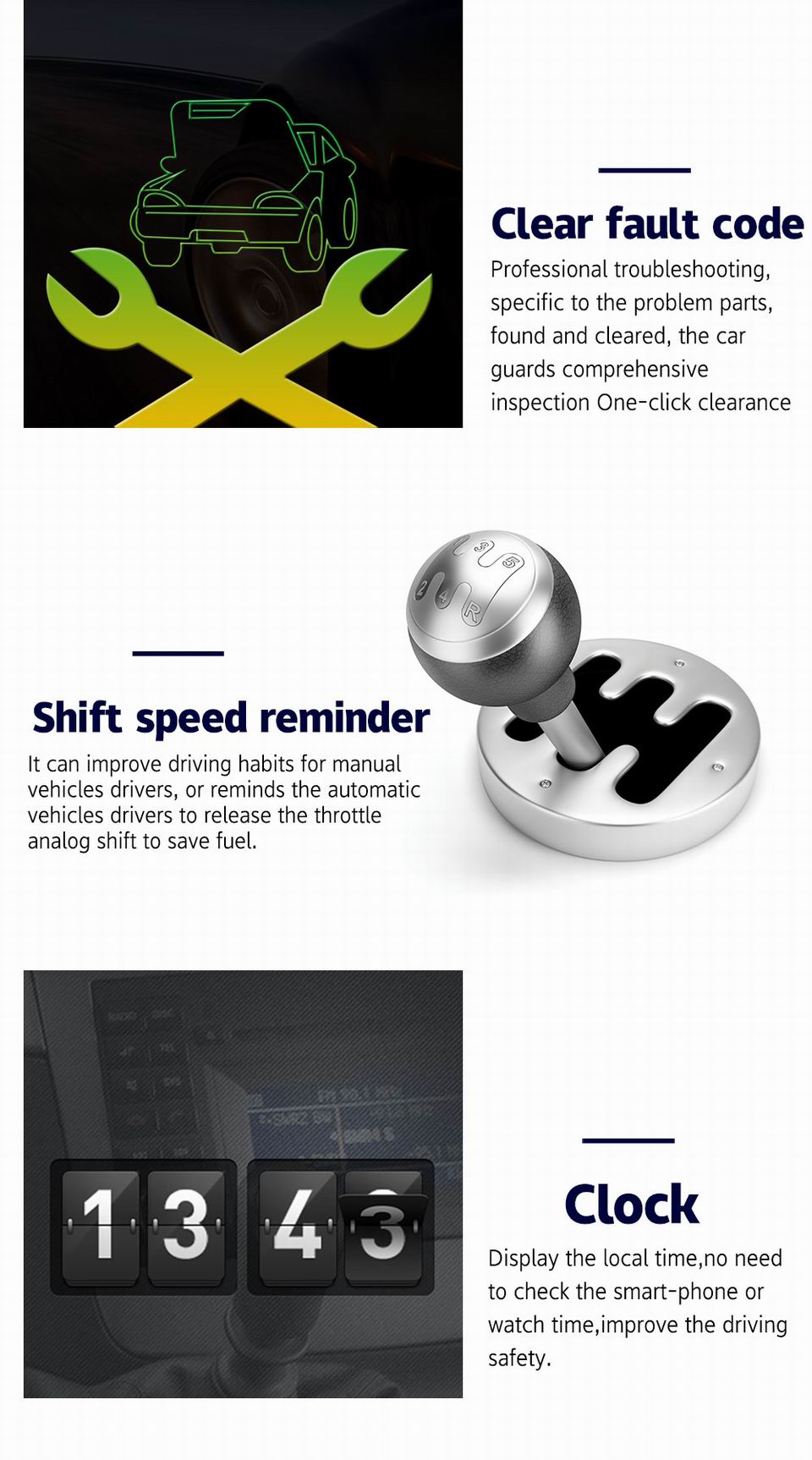 • Display Information:vehiclespeed, engine RPM, water temperature, voltage, instantaneous fuelconsumption, average fuel consumption, single driving distance,totaldriving distance, driving time,turbo pressure, Air/Fuel Ratio, oil temperature