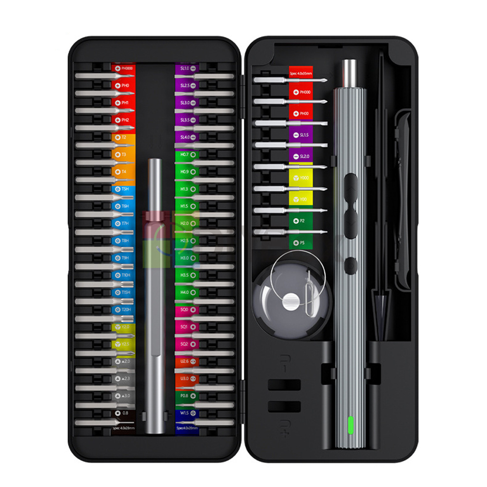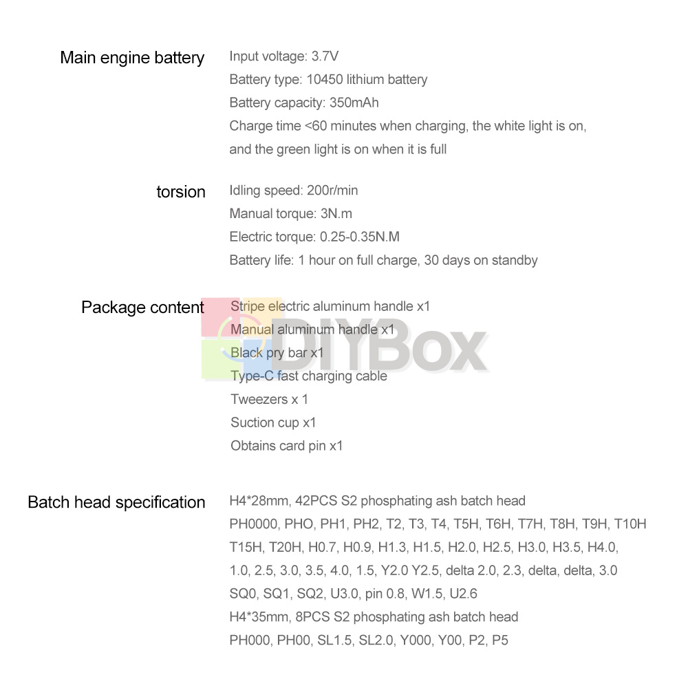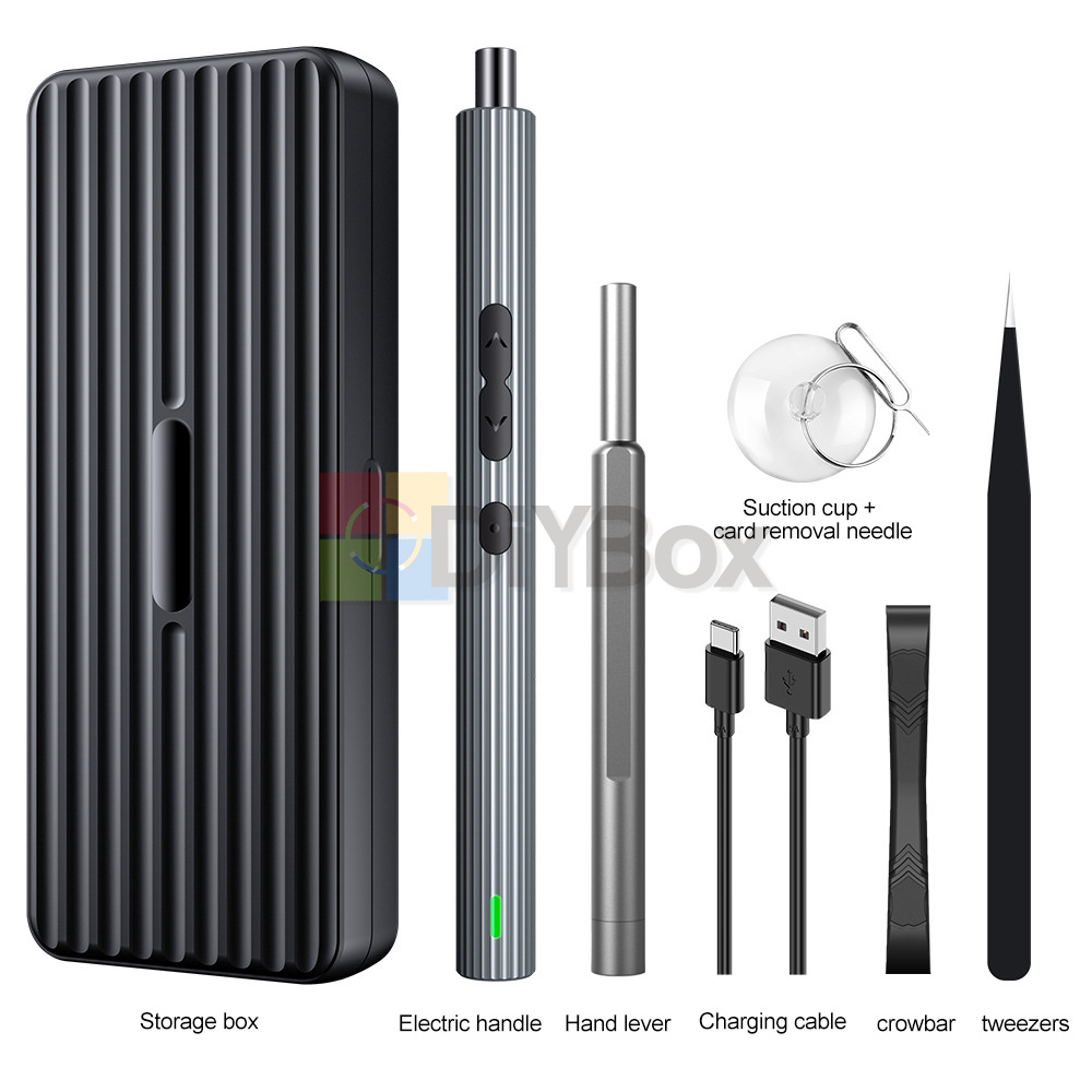 Package includes: electric screwdriver * 1+manual handle * 1+pry bar * 1+tweezers * 1+charging cable * 1+suction cup * 1+card reader * 1+batch head * 50+instruction manual * 1