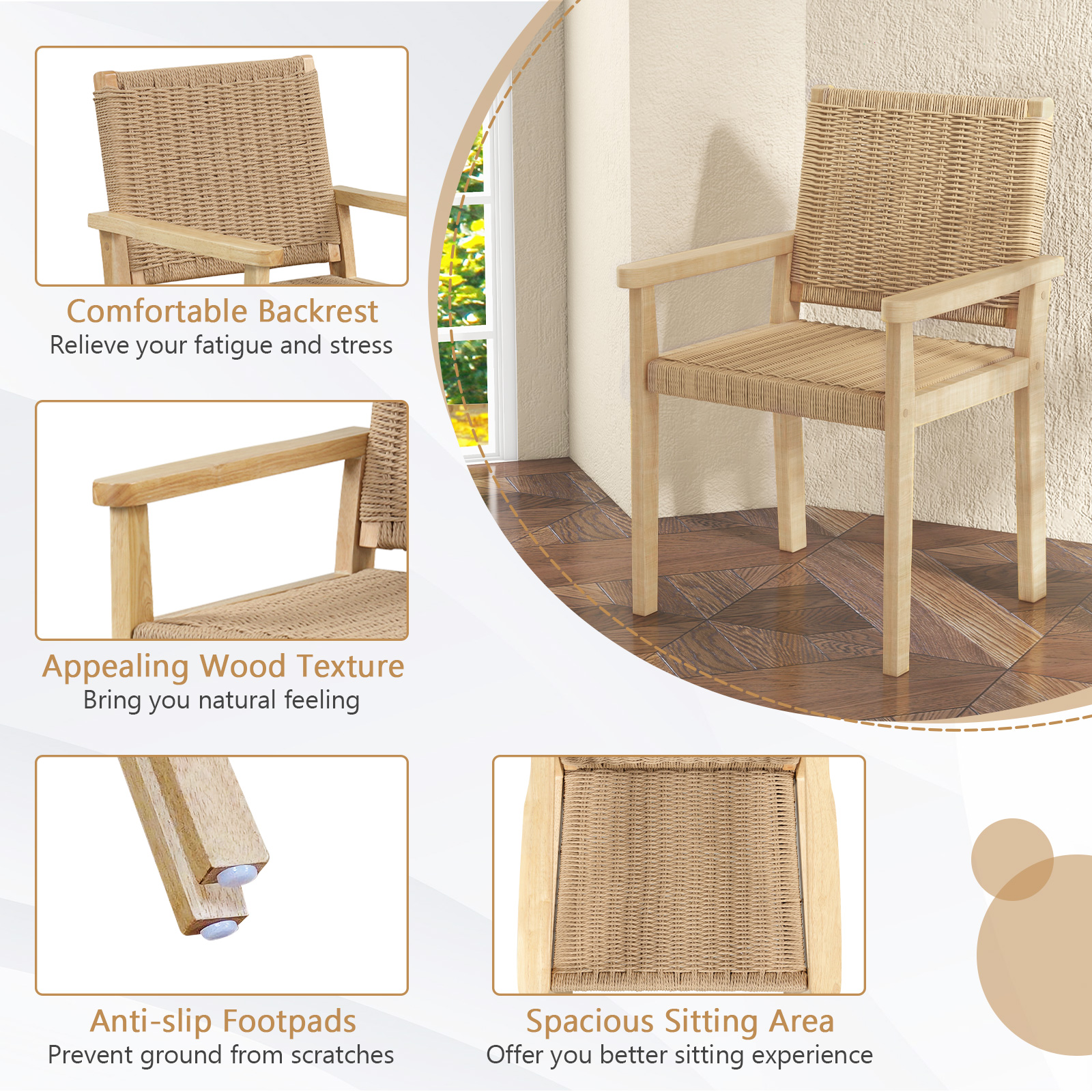 This set of 2 rubber wood chairs with a robust material is a versatile and elegant addition to any indoor or outdoor space. Constructed with sturdy and durable solid rubber wood frames, these chairs are built to withstand regular and frequent use over time. The attractive wood texture provides a natural look and adds a touch of elegance. A standout feature of these chairs is the paper rope woven seat, which not only adds a unique and stylish touch but also offers a breathable seating experience. Overall, this set of 2 wood chairs with paper rope woven seats and solid rubber wood frames provides an elegant seating option for various indoor and covered outdoor spaces.