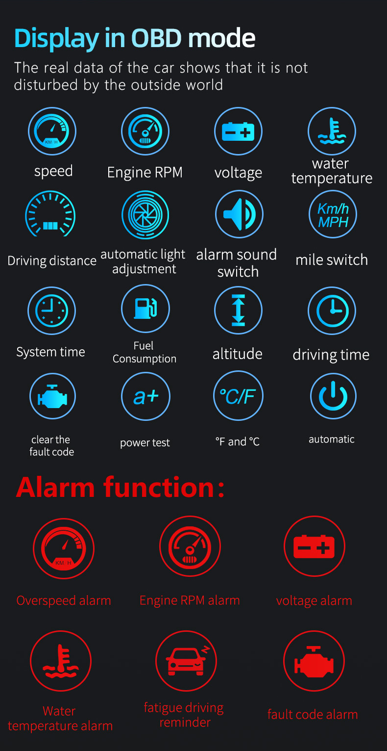 OBD information: vehicle speed,engine RPM,water temperature,voltage,instantaneous fuel consumption,driving distance measurement,driving time,compass,clear the fault code